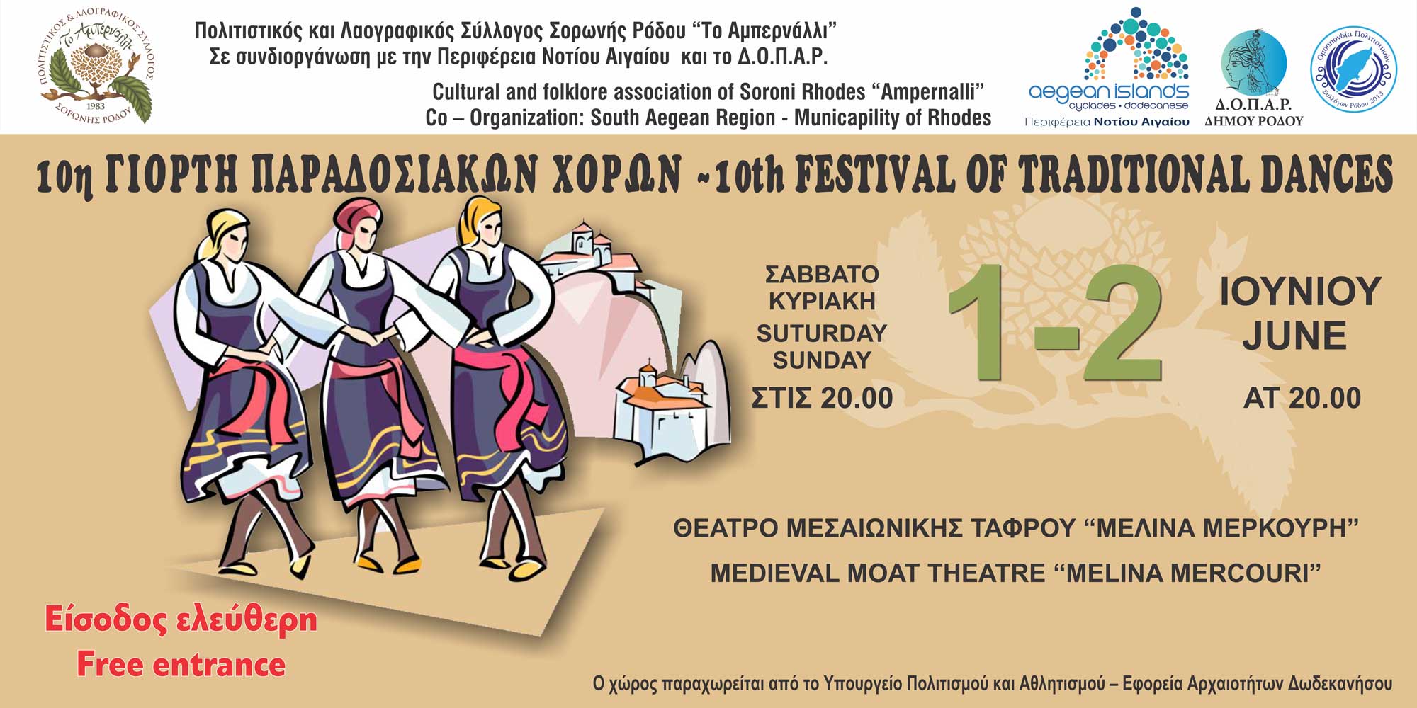 -Ο Πολιτιστικός και Λαογραφικός Σύλλογος Σορωνής Ρόδου ‘Το Αμπερνάλλι’ σε συνδιοργάνωση με την Περιφέρεια Νοτίου Αιγαίου και το ΔΟΠΑΡ, διοργανώνει τη 10η Γιορτή Παραδοσιακών Χορών στις 1 και 2 Ιουνίου 2019, στο θέατρο της μεσαιωνικής τάφρου «Μελίνα Μερκούρη» στις 20.00 .