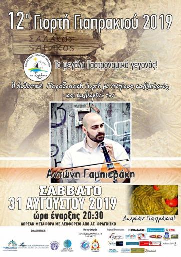 ΠΡΟΣΚΛΗΣΗ-Ο Πολιτιστικός Σύλλογος Σαλάκου «Το Σπήλαιο» Σας προσκαλεί στην 12η γιορτή Γιαπρακιού στην Σάλακο, το Σάββατο 31 Αυγούστου 2019 και ώρα 20:30.