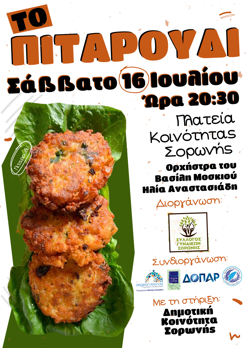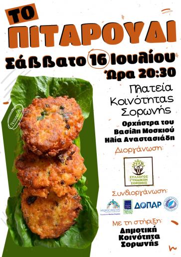 - Ο Σύλλογος Γυναικών Σορωνής διοργανώνει το Σάββατο 16 Ιουλίου 2022 και ώρα 20:30 στην Πλατεία Κοινότητας Σορωνής, την 4η Βραδιά αφιερωμένη στο παραδοσιακό πιταρούδι.