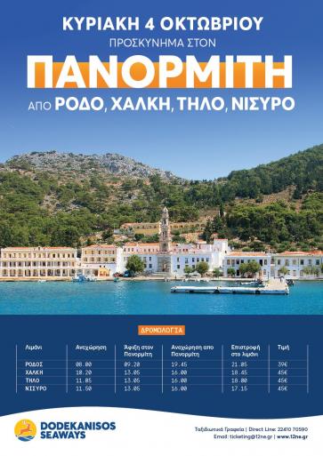Εκδρομή στον Πανορμίτη από Ρόδο, Χάλκη, Τήλο και Νίσυρο, την Κυριακή 4 Οκτωβρίου Η Dodekanisos Seaways πραγματοποιεί την Κυριακή 4 Οκτωβρίου, μονοήμερη εκδρομή στο μοναστήρι του Πανορμίτη από Ρόδο, Χάλκη, Τήλο και Νίσυρο.