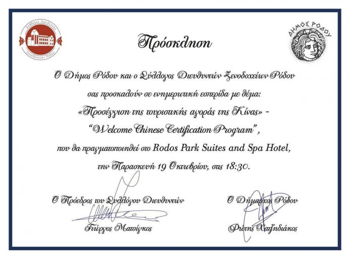 Ο Δήμος Ρόδου και ο Σύλλογος Διευθυντών Ξενοδοχείων Ρόδου διοργανώνουν την Παρασκευή, 19 Οκτωβρίου, στις 18:30, εκδήλωση με θέμα «Προσέγγιση της τουριστικής αγοράς της Κίνας» (Welcome Chinese Certification Program). Η εκδήλωση θα πραγματοποιηθεί στο Rodos Park Suites and Spa Hotel. - Το πρόγραμμα συντονίζει και παρουσιάζει ο δημοσιογράφος και προϊστάμενος του οικονομικού ρεπορτάζ του Alpha, κ. Σταύρος Μονεμβασιώτης. Ο ΔΡΟΜΟΣ ΤΗΣ ΠΡΟΣΕΓΓΙΣΗΣ ΤΟΥ ΤΟΥΡΙΣΤΙΚΟΥ ΚΥΜΑΤΟΣ ΑΠΟ ΤΗΝ ΚΙΝΑ “WELCOME CHINESE CERTIFICATION PROGRAM” THE PATH OF APPROACHING AND ATTRACTING THE WAVE OF TRAVELLERS FROM CHINA “WELCOME CHINESE CERTIFICATION PROGRAM” 19 ΟΚΤΩΒΡΙΟΥ 2018 - RODOS PARK SUITES & SPA – ΡΟΔΟΣ 19 OCTOBER 2018 - RODOS PARK SUITES & SPA – RHODOS ΔΙΟΡΓΑΝΩΣΗ: ΔΗΜΟΣ ΡΟΔΟΥ – ΣΥΛΛΟΓΟΣ ΔΙΕΥΘΥΝΤΩΝ ΞΕΝΟΔΟΧΕΙΩΝ ΡΟΔΟΥ – WELCOME CHINESE - GREECE ΧΟΡΗΓΟΙ ΕΚΔΗΛΩΣΗΣ: ΣΥΛΛΟΓΟΣ ΔΙΕΥΘΥΝΤΩΝ ΞΕΝΟΔΟΧΕΙΩΝ ΡΟΔΟΥ – ATRIUM HOTELS – RODOS PARK SUITES & SPA HOTEL 18:30 – 19:00 Προσέλευση – Εγγραφή Opening - Subscription 19:00 – 19:10 Παρουσίαση του προγράμματος & ομιλητών Σταύρος Μονεμβασιώτης Presentation of the program & speakers Stavros Monemvasiotis 19:10 – 19:30 «Ο πολιτισμός ως πόλος έλξης τουριστών από την Κίνα» Σταύρος Μονεμβασιώτης – Δημοσιογράφος, επικεφαλής του προγράμματος «Μύκονος – Μονοπάτια Πολιτισμού» "Culture as a path to attract tourists from China" Stavros Monemvasiotis - Journalist, head of the program "Mykonos - Paths of Culture" 19:30 – 19:50 «Elegant Travel – Η συμβολή των κινεζόφωνων εντύπων στην τουριστική ανάπτυξη» Αδριανή Ζουναλή (Εκδότης – Marketing Expert) «Elegant Travel - The Contribution of the Chinese – English laguage Magazine to Tourism Development» Adriani Zounali (Publisher - Marketing Expert) 19:50 – 20:10 Χαιρετισμοί και ζωντανές συνδέσεις από τους Prof. Dai Bin (President of China Tourism Academy), Jacopo Sertoli (President of “Welcome Chinese, Θεοφάνης Σούλης (Tour Operator - Beijing), WANG Chao, Cultural Attaché, Embassy of the People’s Republic of China in Athens Greetings and live links: Prof. Dai Bin (President of China Tourism Academy), Jacopo Sertoli (President of “Welcome Chinese”, Theophanis Soulis (Tour Operator - Beijing), WANG Chao, Cultural Attaché, Embassy of the People’s Republic of China in Athens 20:10 – 20:30 «Το πρόγραμμα Πιστοποίησης Welcome Chinese και η σημασία του για την προσέλκυση Κινέζων Τουριστών» Ηλίας Παπαγεωργίου (Εκπρόσωπος του Προγράμματος στην Ελλάδα) "Welcome Chinese Certification Program and its Importance to Attract Chinese Tourists" Ilias Papageorgiou – Country Manager - Greece 20:30 – 20:50 Ερωτήσεις (Απαντήσεις από τον Κο Ηλία Παπαγεωργίου και την Κα Elena Padula, Welcome Chinese Sales Account από το κεντρικό γραφείο Ευρώπης. Q&A (Replies from Mr. Ilias Papageorgiou and Mrs Elena Padula, Welcome Chinese Sales Account from Europe headquarters) 20:50 – 21:00 Κλείσιμο ημερίδας και χαιρετισμοί από τον Δήμαρχο Ρόδου, κ. Φώτη Χατζηδιάκο και τον Πρόεδρος του Συλλόγου, Διευθυντών Ξενοδοχείων Ρόδου κ. Γιώργο Ματσίγκο Closing of the meeting and greetings from the Mayor of Rhodes, Fotis Chatzidiakos and the President of The Rhodes Hotel Managers Association Mr. Giorgos Matsigkos 21:00 Τέλος της Εσπερίδας – Cocktail finger food End of meeting – Cocktail finger food Το πρόγραμμα συντονίζει και παρουσιάζει ο δημοσιογράφος, προϊστάμενος του οικονομικού ρεπορτάζ του Alpha, Σταύρος Μονεμβασιώτης The program is coordinated and presented by the journalist, head of Alpha's economic reportage, Stavros Monemvasiotis