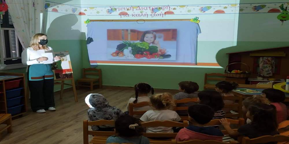 Η κ. Τσισιμοίρη μίλησε στα παιδιά για την υγιεινή διατροφή, ώστε να έχουν μια καλύτερη ποιότητα ζωής μετέπειτα ως ενήλικες. Μέσα από ένα παραμύθι προσπάθησε να τους μεταδώσει τις θρεπτικές αξίες κάθε ομάδας τροφίμων και να τους μυήσει σε καλύτερες διατροφικές συνήθειες.
