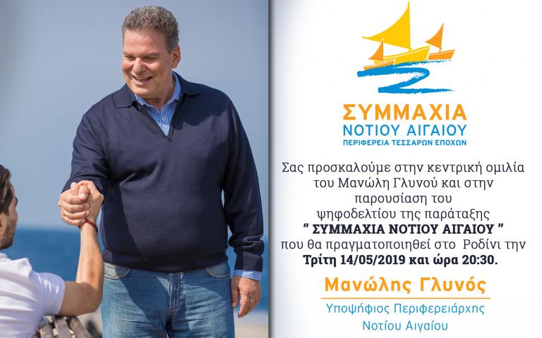 ΠΡΟΣΚΛΗΣΗ-Σας προσκαλούμε την Τρίτη 14 Μαΐου στις 20:30, στην κεντρική ομιλία- παρουσίαση του ψηφοδελτίου της παράταξής μας «Συμμαχία Νοτίου Αιγαίου», στο Ροδίνι.