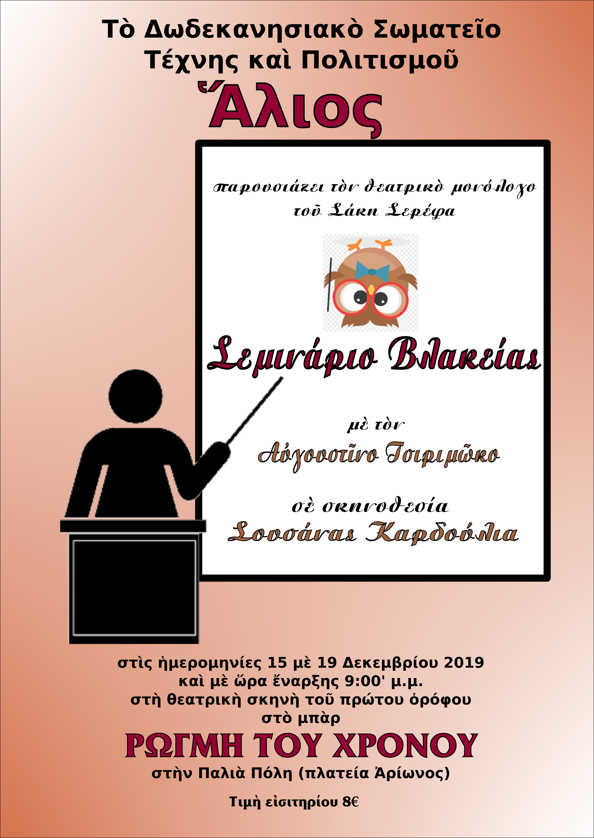 ΔΕΛΤΙΟ ΤΥΠΟΥ-Το Δωδεκανησιακό Σωματείο Τέχνης και Πολιτισμού «Ἅλιος» παρουσιάζει τον θεατρικό μονόλογο του Σάκη Σερέφα «Σεμινάριο Βλακείας» στις 15‒19 Δεκεμβρίου 2019 (στὶς 9.00 μ.μ.) στον επάνω όροφο του μπαρ «ΡΩΓΜΗ ΤΟΥ ΧΡΟΝΟΥ» (πλατεία Αρίωνος) στὴν Παλιά Πόλη.