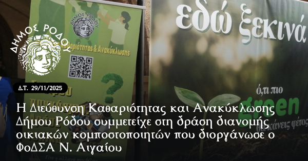 Η Διεύθυνση Καθαριότητας και Ανακύκλωσης Δήμου Ρόδου συμμετείχε στη δράση διανομής οικιακών κομποστοποιητών που διοργάνωσε ο ΦοΔΣΑ νοτίου Αιγαίου