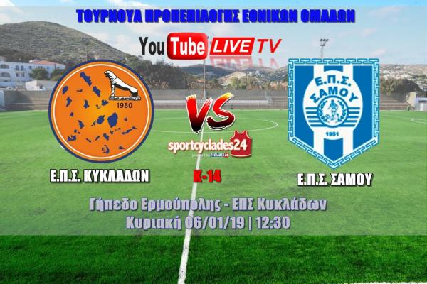 -Παρακολουθήστε ζωντανά, σήμερα Κυριακή 6 Ιανουαρίου (12:30 και 14:30) από το γήπεδο της ΕΠΣ Κυκλάδων στην Ερμούπολη τους αγώνες της Κ14 και ...