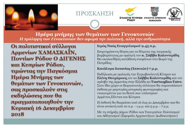 Ο Σύλλογος Κυπρίων Ροδου σας προσκαλεί σε εκδήλωση που διοργανώνει με το σύλλογο Αρμενίων Χαμασκαιν και Ποντίων ο Διγενής τιμώντας τη παγκόσμια ημέρα μνήμης των θυμάτων ...