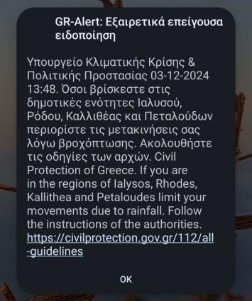 Νέο μήνυμα απο το 112 προ δημοτικές ενότητες Ρόδου, Καλλιθέας, Ιαλυσού και Πεταλούδων για περιορισμό των μετακινήσεων λόγω ισχυρής βροχόπτωσης
