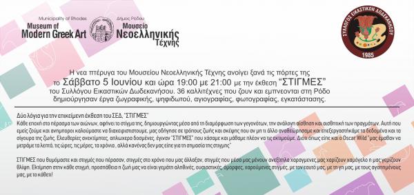 - Έκθεση «Στιγμές» του Συλλόγου Εικαστικών Δωδεκανήσου
