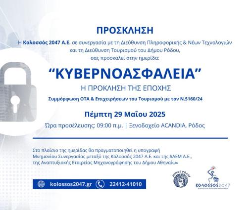Ημερίδα για την «Κυβερνοασφάλεια» διοργανώνουν ο Δήμος Ρόδου και ο Αναπτυξιακός Οργανισμός του «ΚΟΛΟΣΣΟΣ 2047 Α.Ε.»