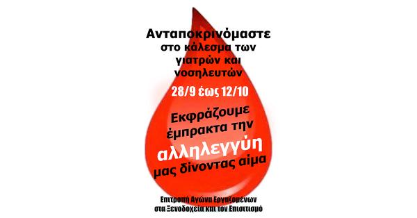 ΔΕΛΤΙΟ ΤΥΠΟΥ-Η Επιτροπή Αγώνα Εργαζομένων στα Ξενοδοχεία και τον Επισιτισμό οργανώνει εθελοντική αιμοδοσία ή οποία έχει ήδη ξεκινήσεις από τις 28/9 ως και θα ...