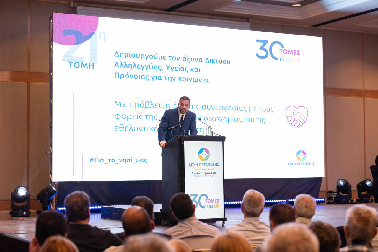 Σε όλη τη διάρκεια της ομιλίας της ομιλίας του κ. Νίκου Γερονικόλα, προβάλλονταν στη γιγαντοοθόνη μία προς μία οι 30 Τομές του προγράμματος της παράταξης «Αρχή Οργάνωσης», μαζί με τις αναλύσεις τους και τη σύνδεσή τους σε Τομεακά Προγράμματα Ανάπτυξης των Υπουργείων, του ΕΣΠΑ και Ευρωπαϊκών Πρωτοβουλιών για απομακρυσμένες περιοχές. Ταυτόχρονα, έγινε η παρουσίαση των υποψηφίων δημοτικών συμβούλων και τοπικών συμβούλων του ψηφοδελτίου «Αρχή Οργάνωσης» για το νησί μας.