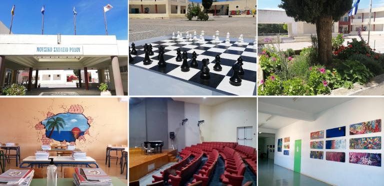 - Το Μουσικό Σχολείο Ρόδου είναι Γυμνάσιο με Λυκειακές τάξεις. Οι μαθητές και οι μαθήτριες παρακολουθούν τα μαθήματα γενικής παιδείας, κατευθύνσεων και επιλογής (του Λυκείου), όπως σε όλα τα Σχολεία. Παράλληλα και επιπρόσθετα, διδάσκονται μαθήματα μουσικής, όπως θεωρητικά και ιστορία της ευρωπαϊκής, της βυζαντινής και παραδοσιακής μουσικής και μουσικά όργανα (ευρωπαϊκά και παραδοσιακά) σε ατομικά μαθήματα. Μία από τις καινοτομίες αυτών των Σχολείων είναι οι ώρες των μουσικών συνόλων, ευρωπαϊκών και παραδοσιακών, όπου όλα τα παιδιά, αναλόγως τις μουσικές επιλογές τους, συμμετέχουν στις πρόβες και στις δεκάδες συναυλίες και πολιτιστικές εκδηλώσεις. Συμπληρώνοντας τις τέχνες, υπάρχουν ομάδες θεάτρου, χορού και εικαστικής δημιουργίας. Το Σχολείο λειτουργεί 42 ώρες την εβδομάδα και πιο συγκεκριμένα με εννιάωρα την Τρίτη και την Πέμπτη (έως τις 15:00) και με οκτάωρα τις υπόλοιπες ημέρες (έως τις 14:30). Προσφέρεται καθημερινή δωρεάν μεταφορά προς στο Σχολείο και αντίστροφα με λεωφορεία, καθώς και σίτιση, σε συνεργασία με την Περιφέρεια Νοτίου Αιγαίου και το Δήμο Ρόδου.