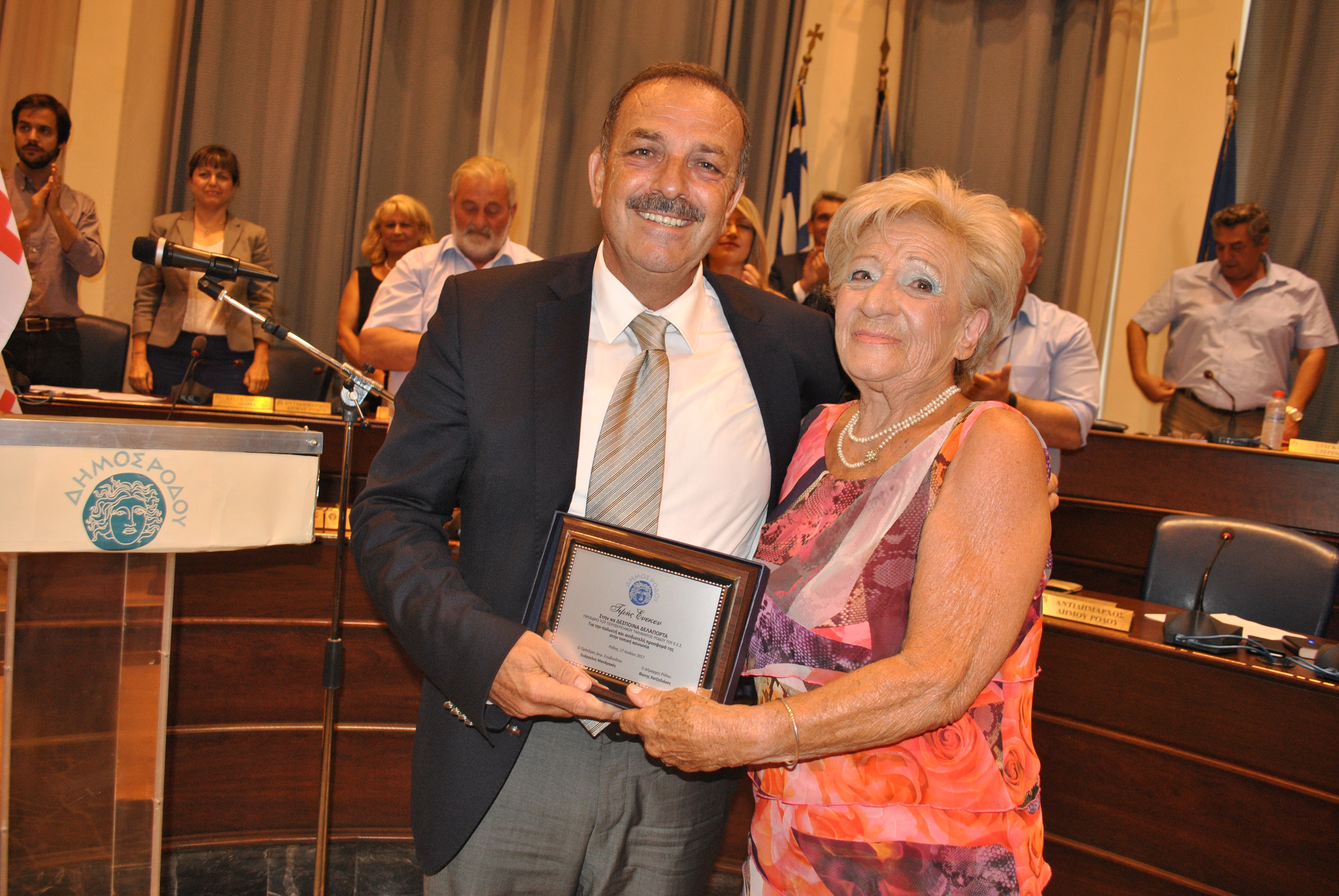 ΔΕΛΤΙΟ ΤΥΠΟΥ-«Αριστείον Τιμής» στην κ. Δέσποινα Δελαπόρτα, για την πολυετή και ανιδιοτελή προσφορά της στην τοπική κοινωνία -Με αφορμή τη συμπλήρωση 20 χρόνων στο τιμόνι του τοπικού παραρτήματος του Ερυθρού Σταυρού, το Δημοτικό Συμβούλιο του Δήμου Ρόδου απένειμε τη Δευτέρα 17 Ιουλίου 2017 τιμητική διάκριση στην κα. Δέσποινα Δελαπόρτα. Η βράβευση τελέστηκε σε κλίμα σεμνότητας και συγκίνησης, παρουσία σύσσωμου του Δημοτικού Συμβουλίου, εκπροσώπων της Εκκλησίας, των Σωμάτων Ασφαλείας, της Περιφέρειας, συμπολιτών μας που υπηρετώντας από θέσεις ευθύνης στο παρελθόν συνεργάστηκαν με την κα. Δελαπόρτα, καθώς και εκπροσώπων των εθελοντικών σωματείων του Δήμου. «Πολλῶν χρημάτων κρείττων ὁ παρὰ τῆς πόλεως ἔπαινος» δήλωσε ο Δήμαρχος Ρόδου κος. Φώτης Χατζηδιάκος, αναφερόμενος στη φράση του Ισοκράτη, τονίζοντας ότι η αναγνώριση και η επιβράβευση αυτή διακρίνει τις αξιοκρατικές πολιτείες και δημιουργεί πρότυπα ζωής, ενώ ανέφερε ότι στο πρόσωπο της κας. Δελαπόρτα συγκεντρώνονται οι αρετές του υπεύθυνου πολίτη, που με την κοινωνική της δράση, την ευγένειά της, την καλοσύνη της, την ευαισθησία της μα πάνω από όλα με την προσφορά της, της έχουν προσδώσει ξεχωριστή θέση στη συνείδηση των συμπολιτών μας. Η κοινωνική πολιτική του Δήμου Ρόδου μέσα από μια γόνιμη, δημιουργική, ανθρωπιστική συνεργασία στηρίζει τους κοινούς στόχους, τις κοινές αντιλήψεις, τις κοινές θέσεις πάνω στα σύγχρονα κοινωνικά και οικονομικά προβλήματα που αντιμετωπίζουμε, αξιοποιώντας τις γνώσεις και την εμπειρία τόσο της κας. Δελαπόρτα όσο και όλων των μελών του Παραρτήματος του Ελληνικού Ερυθρού Σταυρού και των Εθελοντών Σαμαρειτών, για την παροχή πρώτων βοηθειών σε ευάλωτα κοινωνικά ιδρύματα, σε παιδιά, σε ΑμΕΑ, σε υπερήλικες και σε κάθε συμπολίτη μας που έχει ανάγκη και χρήζει βοήθειας.