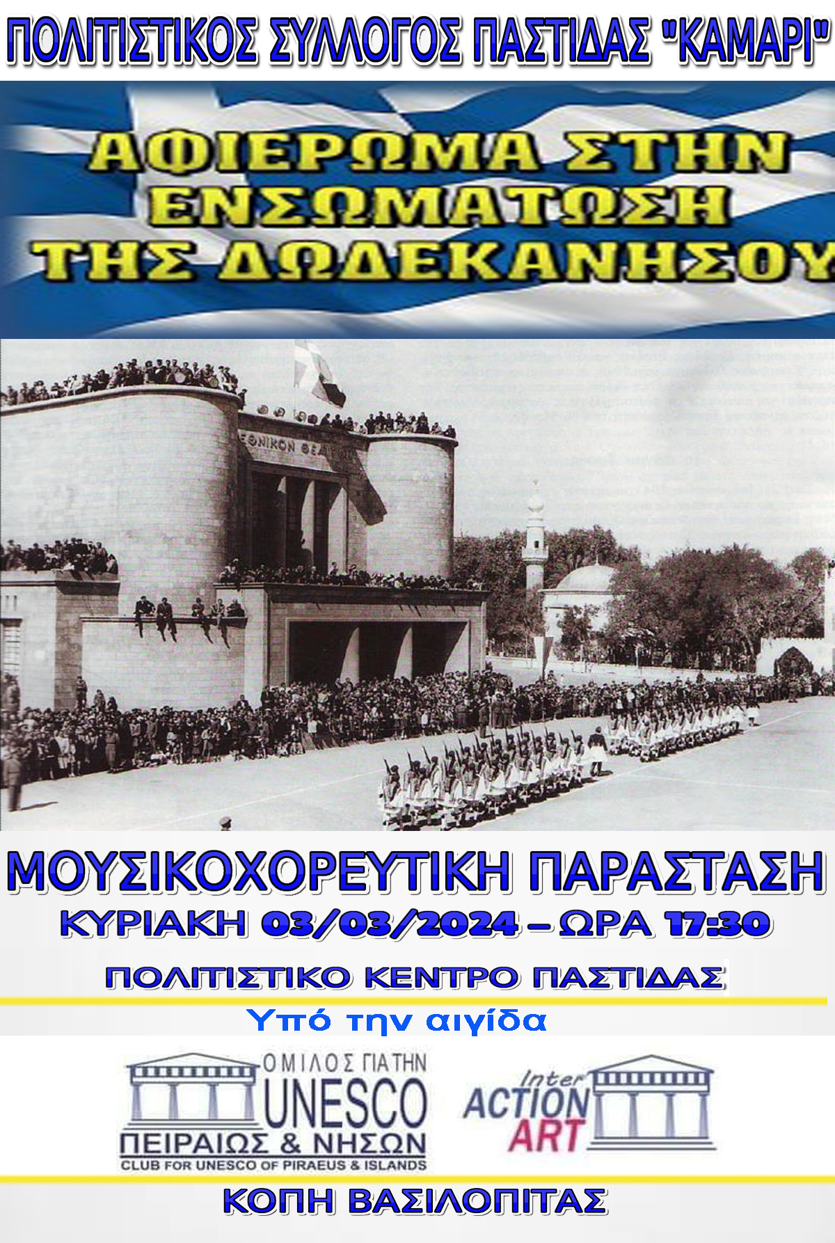 Ο Πολιτιστικός Σύλλογος Παστίδας Ρόδου «Καμάρι» θα πραγματοποιήσει μουσικοχορευτική παράσταση αφιέρωμα στην Ενσωμάτωση της Δωδεκανήσου με την Μητέρα Ελλάδα, την Κυριακή 03-03-2024 και ώρα 17:30 στο Πολιτιστικό Κέντρο Παστίδας (έναντι Δημοτικής Κοινότητας Παστίδας) με ελεύθερη είσοδο.