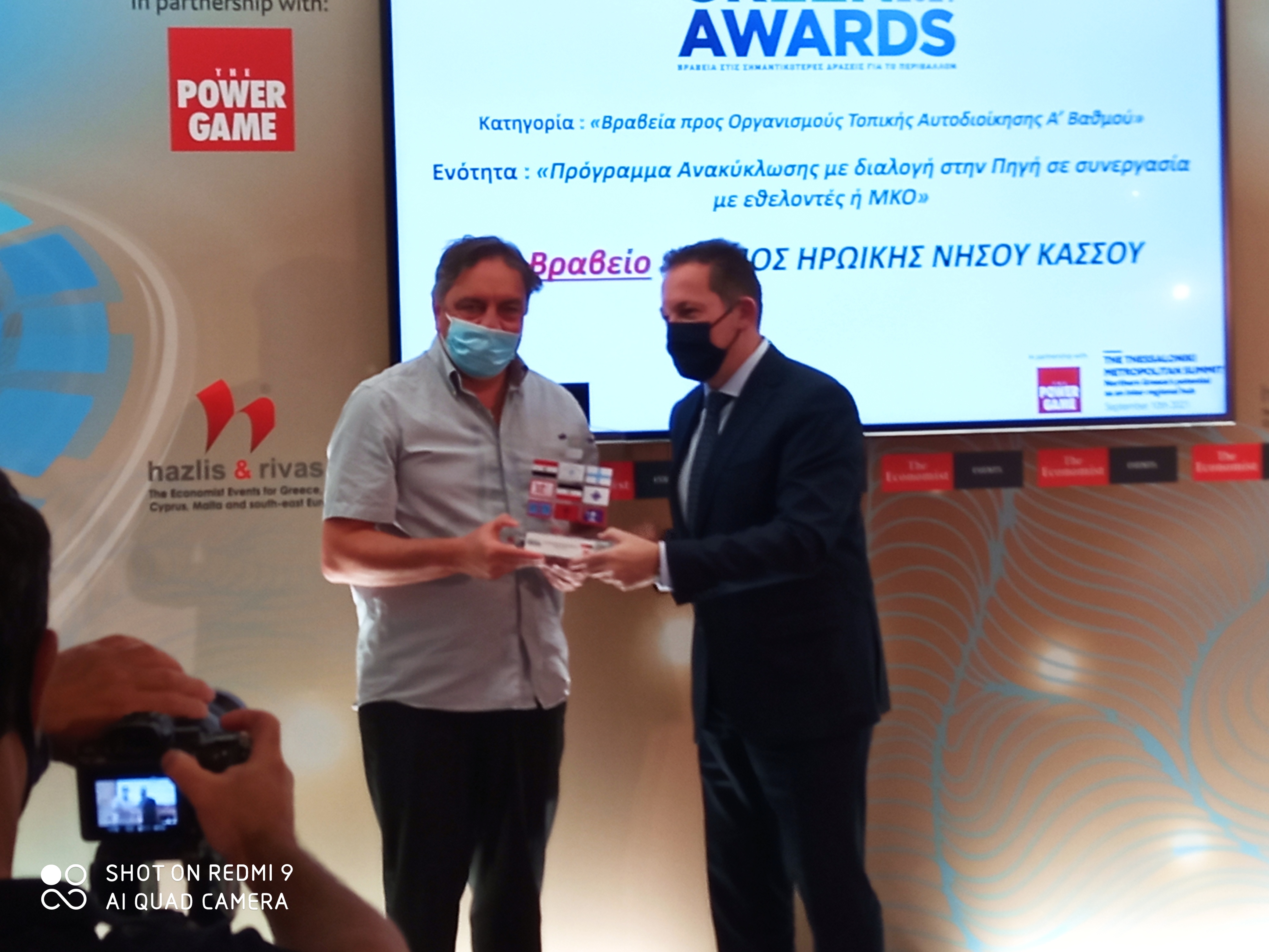 Συγκεκριμένα η Κάσος δια του Δημάρχου της Μιχάλη Ερωτόκριτου και του εκπροσώπου της «ΚΑΣΙΟΣ ΚΟΙΝΣΕΠ» Γιάννη Φραγκούλη βραβεύτηκε για το «Πρόγραμμα Ανακύκλωσης με διαλογή στην πηγή σε συνεργασία με εθελοντές ή ΜΚΟ».