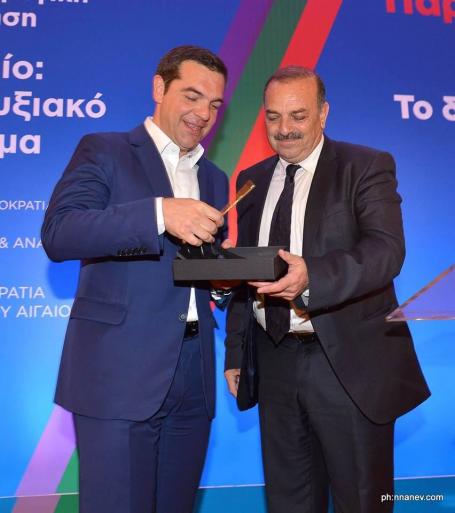 ΡΟΔΟΣ, 17η Απριλίου 2018. Αξιότιμε κ. Πρωθυπουργέ, Παρακαλούμε, όπως δεχθείτε από τον Δήμο Ρόδου, ως ενθύμιον, για την παρουσία σας στο 13ο Αναπτυξιακό Συνέδριο, στο πλαίσιο της διαμόρφωσης της «Εθνικής Αναπτυξιακής Στρατηγικής 2021», ένα συλλεκτικό έργο, αντάξιο της ιστορικής επετείου της Ενσωμάτωσης των Δωδεκανήσων στην Ελλάδα. Στις 7 Μαρτίου 1948, ημέρα της δικαίωσης των αγώνων και των θυσιών του Δωδεκανησιακού Λαού, ο τότε δήμαρχος Ρόδου προσέφερε «το πιστό αντίγραφο του κλειδιού της πόλης», στον τότε Ανώτατο πολιτειακό ΄Αρχοντα της Ελλάδας, στον βωμό της Πατρίδας, παρουσία του επίσημου Ελληνικού Κράτους, των Μελών της Κυβέρνησης, της Στρατιωτικής Ηγεσίας, των Εκκλησιαστικών Αρχών, της Δημοτικής Αρχής και των Ελεύθερων Δωδεκανησίων. Η Βουλή των Ελλήνων, είχε ανακηρύξει το «2017-ΕΤΟΣ ΔΩΔΕΚΑΝΗΣΟΥ». Με εκτίμηση Ο ΔΗΜΑΡΧΟΣ ΡΟΔΟΥ ΦΩΤΗΣ ΧΑΤΖΗΔΙΑΚΟΣ»