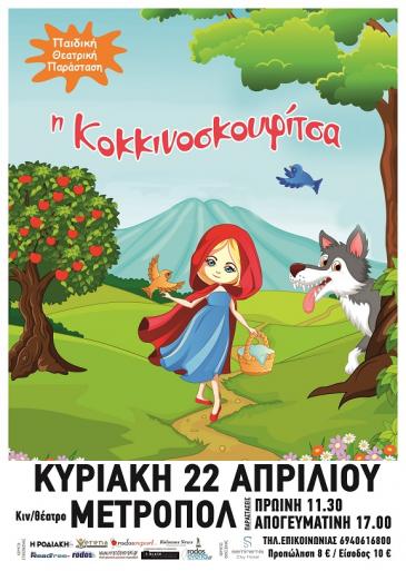 Η Κοκκινοσκουφίτσα, το πιο γνωστό και διάσημο παραμύθι όλων των εποχών, έρχεται στις 22 Απριλίου στο κινηματοθέατρο ΜΕΤΡΟΠΟΛ. Ένα κορίτσι με αγνή καρδιά θα πέσει στην παγίδα του πονηρού Λύκου, που για να την ξεγελάσει θα ντυθεί Μέλισσα.Η μικρή μας θα βρεθεί χαμένη μέσα στο δάσος. Εκεί θα συναντήσει όλα τα ζώα του δάσους. Τον Ρούλη τον Ελεφαντούλη, έναν πολύ πολύ αστείο Γαϊδαράκοκαι πολλά άλλα ζώα, όπου με την βοήθειά τους,αλλά κυρίως με την συμμετοχή των μικρών θεατών,θα καταφέρει να φτάσει στο σπιτάκι της αγαπημένης της γιαγιάς. Εκεί όμως θα την περιμένει μια άσχημη έκπληξη… Τότε η αγαπημένη μας πρωταγωνίστρια θα επικαλεστεί την βοήθεια των παιδιών για να κερδίσει τον πονηρό και πεινασμένο Λύκο. -Η εταιρεία L & S έχει ειδικότητα στις διαδραστικέςπαραστάσεις για παιδιά. Στόχος της ομάδας είναι να δίνει στα παιδιά την ευκαιρία να βιώσουν μια ιστορία, μέσα από την συμμετοχή τους στις διαδραστικές παραστάσεις και να νιώθουν το ευχάριστο αίσθημα της επίτευξης που συμβάλλει στην ανάπτυξη εμπιστοσύνης στον εαυτό τους.