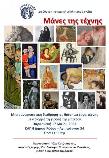 Με αφορμή τη γιορτή της μητέρας θα ξετυλιχθεί μια συναρπαστική διαδρομή σε διάσημα έργα τέχνης με την παρουσίαση "Μάνες της τέχνης", που επιμελείται η Πόλυ Χατζημάρκου, ιστορικός τέχνης, Msc Διοίκηση Πολιτισμικών Μονάδων και ειδική σύμβουλος Δημάρχου.