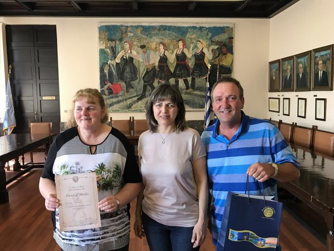 Τιμητικές διακρίσεις παρέλαβε επίσης από την αντιδήμαρχο, ζευγάρι Ελβετών, η κα Annelis και ο κος Roland Dillier, οι οποίοι έχουν έλθει στη Ρόδο 22 φορές και συνήθως διαμένουν στο ξενοδοχείο Alexia Hotel του κου Ιωάννη Ν. Σουλούνια. Στη βράβευση το ζευγάρι συνόδευε η φίλη του κα Myrta Roubeti. Στον κο και την κα Dillier αρέσει να επισκέπτονται τα χωριά της Ρόδου και την παραλία της Τσαμπίκας.