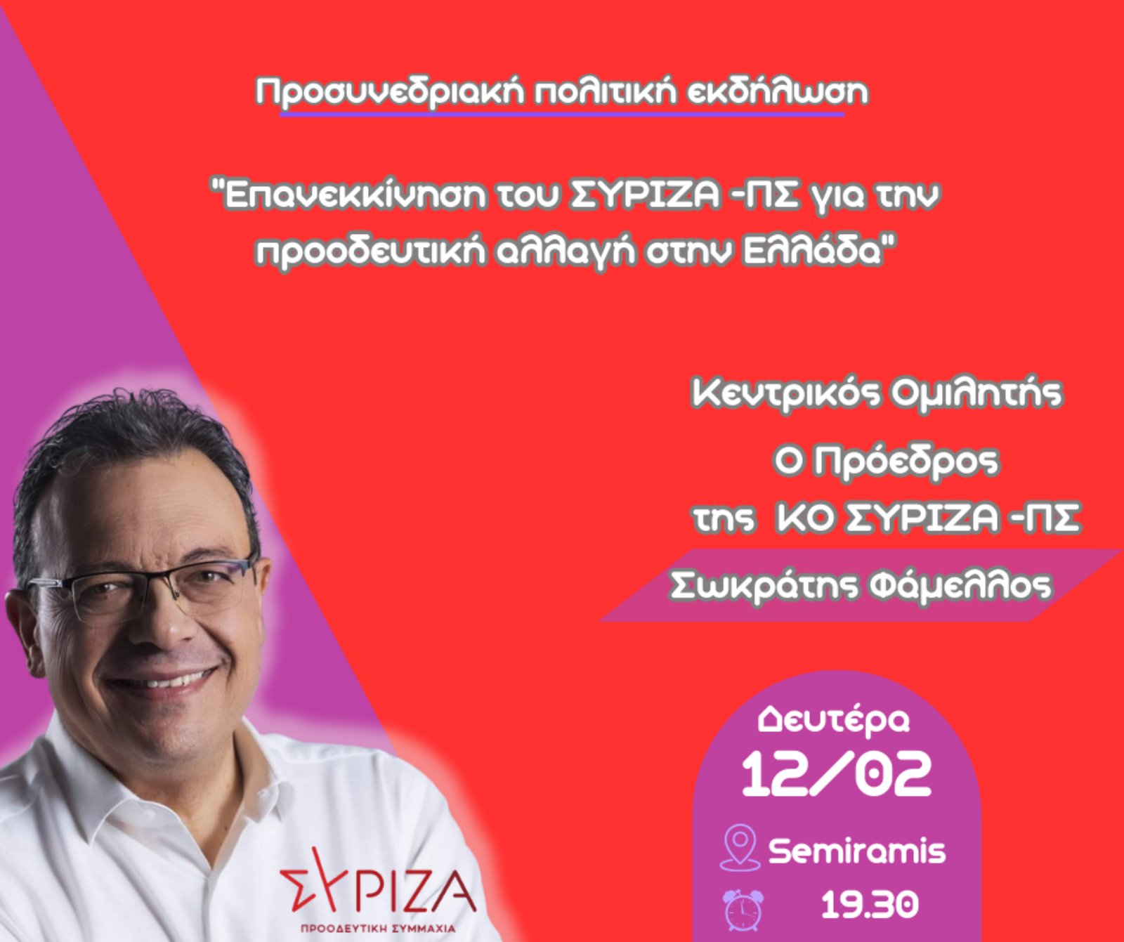 Θέμα: «Προσυνεδριακή ανοιχτή εκδήλωση του ΣΥΡΙΖΑ-ΠΣ Ν. Δωδεκανήσου με τον Σωκράτη Φάμελλο.»