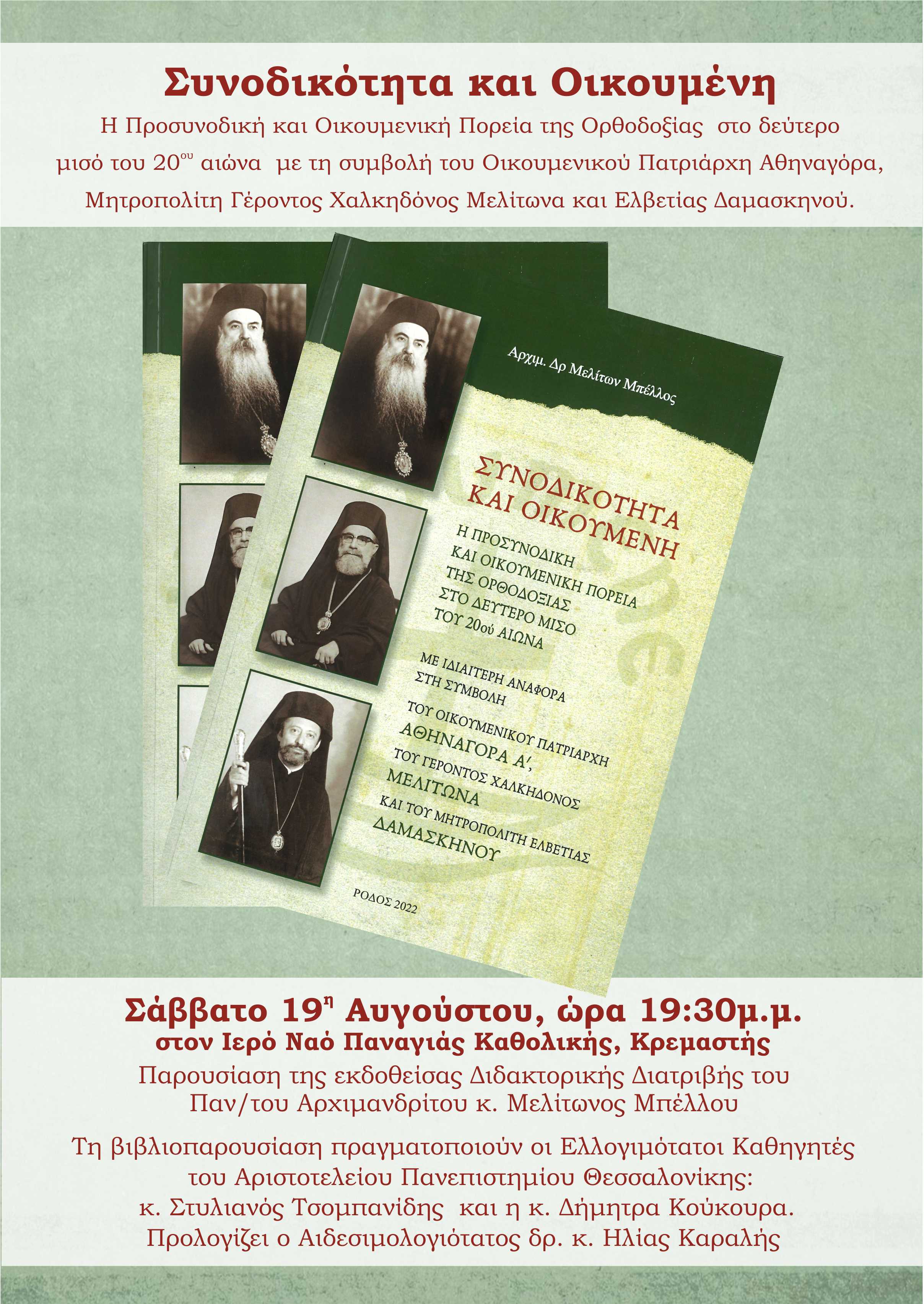 Στο πλαίσιο του Πολιτιστικού Προγράμματος του Ι.Ν. Παναγίας Καθολικής Κρεμαστής, σας προσκαλούμε το Σάββατο 19 Αυγούστου και ώρα 19:30 στην παρουσίαση της εκδοθείσας Διδακτορικής Διατριβής του Πανοσιολογιότατου Αρχιμανδρίτου κ. Μελίτωνος Μπέλλου, με τίτλο: «Συνοδικότητα και Οικουμένη: Η Προσυνοδική και Οικουμενική Πορεία της Ορθοδοξίας στο δεύτερο μισό του 20ου αιώνα με τη συμβολή του Οικουμενικού Πατριάρχη Αθηναγόρα, Μητροπολίτη Γέροντος Χαλκηδόνος Μελίτωνα και Ελβετίας Δαμασκηνού».