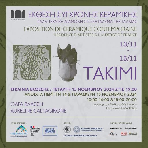 Το Κατάλυμα της Γαλλίας φιλοξενεί την έκθεση σύγχρονης κεραμικής «ΤΑΚΙΜΙ»* των καλλιτέχνιδωνΌλγας Βλάσση (Ελλάδα) και AurélineCaltagirone(Γαλλία) με την οποία ολοκληρώνεται το πρόγραμμα της 6ης Καλλιτεχνικής Διαμονής Σύγχρονης Κεραμικής Τέχνης για το 2024.