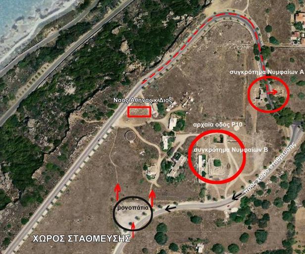 Στην εισήγησή της η πρόεδρος του συλλόγου Μαρία Μιχαλάκη-Κόλλια, αφού παρουσίασε τα μνημεία στάθηκε στο πρόβλημα που δημιουργούν οι υφιστάμενες εγκαταστάσεις κεραιών και παραπηγμάτων. Ανέφερε ότι οι κεραίες είναι πλέον άχρηστες, αφού όλοι οι σταθμοί εξυπηρετούνται από την DIGEA. Αυτό σημαίνει ότι όλες θα μπορούσαν να έχουν αφαιρεθεί από καιρό, ακόμη και η ύψους 27μέτρων κεραία της ΕΡΤ που πατάει εδώ και 45 περίπου χρόνια επάνω στον ναό της Αθηνάς Πολιάδος και του Διός Πολιέως. Ακόμα, η κα Μιχαλάκη- Κόλλια στην εισήγησή της πρότεινε να εξεταστεί από τους αρμόδιους φορείς (Δήμο, Αρχαιολογική Υπηρεσία κλπ) η διακοπή της κυκλοφορίας οχημάτων στο τμήμα της οδού Βορείου Ηπείρου που περνά επάνω από το μεγάλο Νυμφαίο και από το δυτικό τμήμα του Τεμένους της Αθηνάς Πολιάδος και Διός Πολιέως. Σημείωσε μάλιστα ότι τμήμα του μεγάλου Νυμφαίου και του Τεμένους του ναού, είχε ήδη υποστεί καταστροφές εξαιτίας της διάνοιξης της οδού Ακροπόλεως κατά την περίοδο της Ιταλοκρατίας το 1927, όταν δεν ήταν γνωστή η ύπαρξη τους. Τόνισε επίσης ότι «παραπέμποντας στο διάταγμα του 1937 του Ιταλικού Κράτους για κήρυξη της περιοχής σε αρχαιολογικό πάρκο και σε συνδυασμό με την εγκεκριμένη μελέτη διαμόρφωσης από το ΚΑΣ σήμερα μπορούμε να τολμήσουμε να προβούμε σε μια διαφορετική διευθέτηση των οδών Διαγοριδών και Βορείου Ηπείρου, διακόπτοντας την έλευση οχημάτων από τα σημεία που προαναφέρθηκαν». Συνεχίζοντας ανέφερε ότι η νέα διευθέτηση αν και χρειάζεται σχετική ενδελεχή μελέτη δεν φαίνεται να είναι ακατόρθωτη. Με κατάλληλο σχεδιασμό είναι δυνατόν να μετατοπιστεί η πορεία της οδού Διαγοριδών από το τέρμα της προς τα δεξιά, δηλαδή ΒΔ για να συναντήσει την οδό Ακροπόλεως στο τμήμα που δεν έχει μεγάλη υψομετρική διαφορά. Την ίδια πορεία θα μπορεί να ακολουθήσει και η Βορείου Ηπείρου μετά την διασταύρωση, αποφεύγοντας τη στροφή δεξιά προς το Νυμφαίο και τον κύκλο πάνω από τον ναό, αλλά να πάρει αριστερή πορεία μέχρι την νέα διευθέτηση προς την οδό Ακροπόλεως, όπου η υψομετρική διαφορά είναι μικρή. Στην νέα αυτή διάνοιξη βέβαια θα πρέπει να υπολογιστεί η οριοθέτηση του αρχαίου τεμένους Αθηνάς και Διός με τα όρια των αρχαίων οδών, Ρ5, Ρ10, Ρ13, σύμφωνα με την εγκεκριμένη από το ΚΑΣ μελέτη, και αφού βέβαια γίνει μαγνητική διασκόπιση της περιοχής, για να βρεθεί το πιο κατάλληλο έδαφος, χωρίς αρχαία κατάλοιπα, που σίγουρα κάποια περιοχή δεν έχει, αφού σύμφωνα με την περιγραφή του Αίλιου Αριστείδη, «η Ακρόπολη της Ρόδου ήταν πεδίων και αλσών μεστή». Πιστεύουμε και ευχόμαστε πως, ύστερα από την συνάντηση αυτή , τόσο ο Δήμος , όσο και η Εφορεία Αρχαιοτήτων, θα καταφέρουν να αναγκάσουν τους πρώην ιδιοκτήτες των τηλεοπτικών σταθμών, καθώς και την ΕΡΤ να αφαιρέσουν άμεσα τις ανενεργές κεραίες τους και όλα τα υπόλοιπα αυθαίρετα παραπήγματα. Επίσης ευχόμαστε να επιτευχθεί και η μεταφορά της κεραίας της Digea στη θέση που είχε ήδη εγκριθεί από το ΚΑΣ και όχι σ’ αυτήν που η Digea πρότεινε από μόνη της, δημιουργώντας παρερμηνείες. Θερμές ευχαριστίες εκφράζονται στον Δήμαρχο Φώτη Χατζηδιάκο, ο οποίος με προσοχή άκουσε τις προτάσεις και υποσχέθηκε να τις εξετάσει σε συνεργασία με τους υπόλοιπους αρμόδιους φορείς. Τον ευχαριστούμε θερμά για την παρουσία του και τις παρεμβάσεις του, όπως και τους δυο αντιδημάρχους την κα Κρεμαστινού Ροδίτη και τον φίλο μας Τέρη Χατζηιωάννου που συνέβαλε με τις 