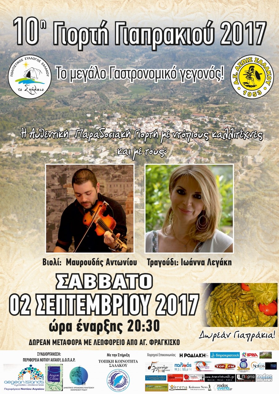 ΔΕΛΤΙΟ ΤΥΠΟΥ-Θέμα: «10η Γιορτή «Γιαπρακιού 2017»- Διήμερο Γαστρονομικό Φεστιβάλ με τουριστικό ενδιαφέρον» Η Περιφέρεια Νοτίου Αιγαίου, ο Δήμος Ρόδου- Δ.Ο.Π.Α.Ρ. ,ο Πολιτιστικός Σύλλογος Σαλάκου ‘Το Σπήλαιο’, ο Αθλητικός Σύλλογος Σαλάκου, και η τοπική κοινότητα Σαλάκου, συνδιοργανώνουν, υπό την αιγίδα της Ομοσπονδίας Πολιτιστικών Συλλόγων Ρόδου, την «10η Γιορτή Γιαπρακιού 2017». Ο Πολιτιστικός Σύλλογος Σαλάκου ‘Το Σπήλαιο’ με την ομόψυχη συμμετοχή όλων των κατοίκων του χωριού , μετά από εννέα χρόνια συνέπειας, επιμονής και πίστης στην παράδοση κατάφεραν ώστε, «Η Γιορτή Γιαπρακιού», να προκαλέσει το ενδιαφέρον πολλών ειδικών γεύσης και να ξεφύγει από τα σύνορα της Ρόδου προβάλλοντας με τον καλύτερο τρόπο την Ροδίτικη Γαστρονομία. Την Παρασκευή 1η Σεπτεμβρίου 2017 οι γυναίκες της Σαλάκου θα παρασκευάσουν τα παραδοσιακά γιαπράκια με περισσή φροντίδα και μεράκι. Φέτος για πρώτη φορά θα συμμετέχουν τουριστικοί επισκέπτες οι οποίοι θα έχουν μία μοναδική και αυθεντική γαστρονομική βιωματική εμπειρία. Το Σάββατο 2 Σεπτεμβρίου στο πάρκο του Αγ. Γεώργιου Σαλάκου στις 20:30 θα διοργανωθεί η μεγάλη παραδοσιακή γιορτή με ντόπιους καλλιτέχνες και τα χορευτικά σχήματα από τους συλλόγους, Τερψιχόρη και του Πολιτιστικού Συλλόγου Σαλακου . Τους ντοπιους καλλιτεχνες θα πλαισιώσει η ΙΩΑΝΝΑ ΛΕΓΑΚΗ και στο βιολί θα είναι ο Μαυρουδής Αντωνίου. Οι χιλιάδες επισκέπτες θα απολαύσουν τα μοναδικά Σαλακενά Γιαπράκια τα οποία προσφέρονται δωρεάν. Την «10η Γιορτή Γιαπρακιού 2017» θα τιμήσει με την παρουσία του ο Κοσμήτορας του Slow Food Αττικής Γρηγόρης Χριστοδούλου και η δημοσιογράφος γεύσης Κατερίνα Βνάτσιου εκπροσωπώντας της Athens Voice. Το Σάββατο 2 Σεπτεμβρίου στις 19:30 το απόγευμα θα υπάρχει δωρεάν μεταφορά με πούλμαν από τον Σαν Φραντσίσκο.