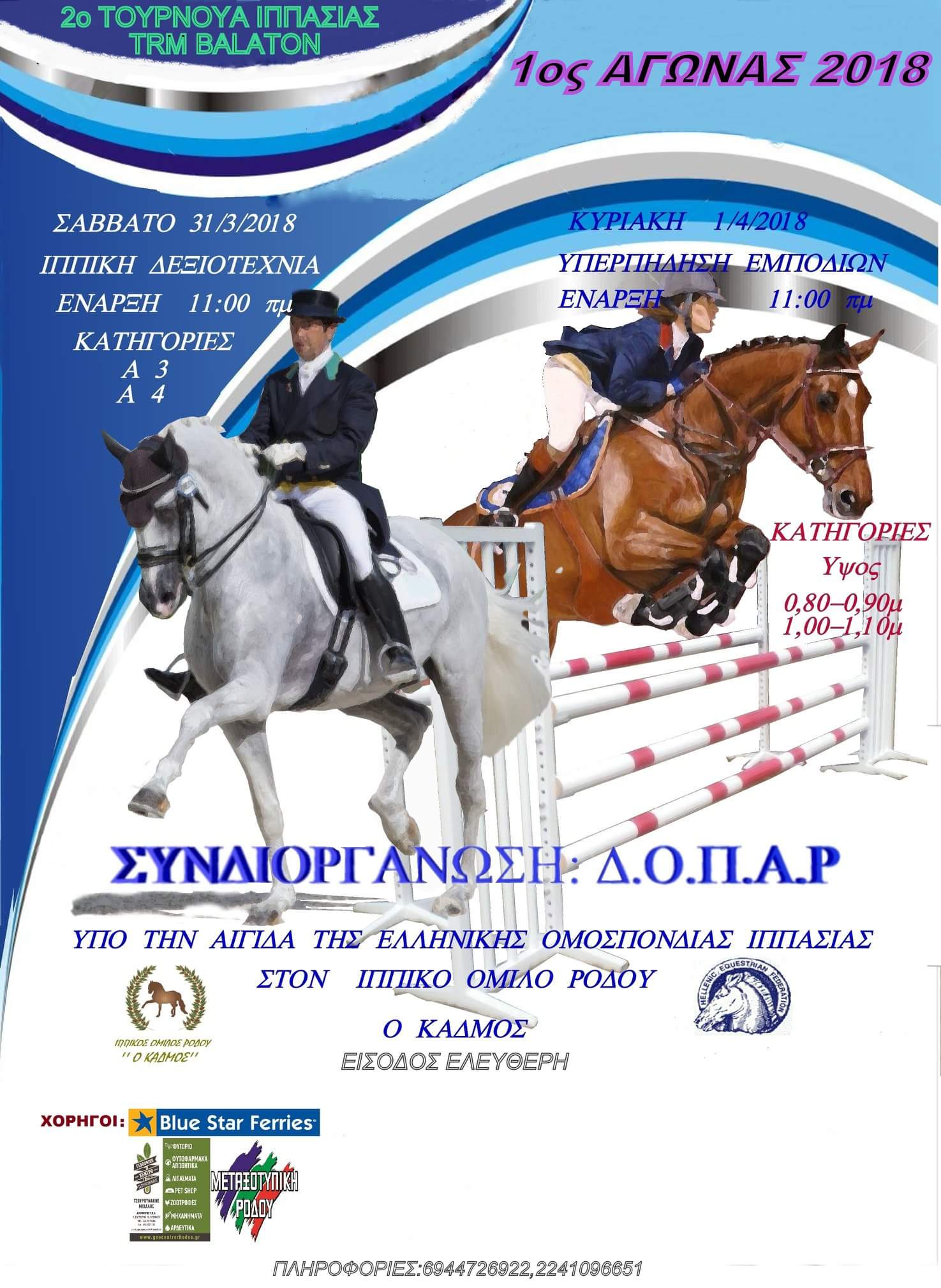 ΔΕΛΤΙΟ ΤΥΠΟΥ-Ένα άλλο ακόμα σημαντικό αθλητικό γεγονός γίνεται αυτό το Σάββατο – Κύριακο (31 Μαρτίου – 1η Απριλίου) στη Ρόδο. Συγκεκριμένα στις εγκαταστάσεις του Ιππικού Ομίλου Ρόδου «Ο Κάδμος» διοργανώνεται υπό την αιγίδα της Ελληνικής Ομοσπονδίας Ιππασίας και συνδιοργανωτή τον Δημοτικό Οργανισμό Πολιτισμού και Αθλητισμού Ρόδου (Δ.Ο.Π.Α.Ρ.), το 1ο τουρνουά ανάπτυξης της Ε.Ο.Ι. με την επωνυμία «TRM Τουρνουά Ανάπτυξης 2018». Η Ιππασία όπως είναι γνωστό είναι Ολυμπιακό άθλημα εδώ και αρκετές δεκαετίες με τεράστιες προοπτικές ανάπτυξης στην χώρα μας και στο νησί μας. Την 1η ημέρα θα διεξαχθούν αγώνες Ιππικής δεξιοτεχνίας με ώρα έναρξης 10 το πρωί ενώ την 2η αγώνες υπερπήδησης εμποδίων με ώρα έναρξης 11 το πρωί. Είναι μια άλλη διοργάνωση που στηρίζει ο Δ.Ο.Π.Α.Ρ. και ο Πρόεδρος του Στέφανος Κυριαζής, στα πλαίσια της ανάπτυξης του αθλητικού τουρισμού στο νησί μας.