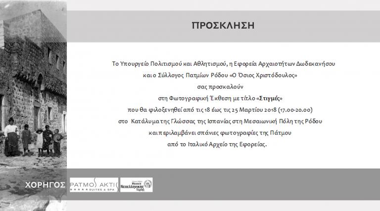 ΔΕΛΤΙΟ ΤΥΠΟΥ-Στιγμές. -Η Πάτμος μέσα από τον φακό των Ιταλών -Η Εφορεία Αρχαιοτήτων Δωδεκανήσου και ο Σύλλογος Πατμίων Ρόδου «Ο Όσιος Χριστόδουλος» σας προσκαλούν στην έκθεση φωτογραφίας με τίτλο «Στιγμές. Η Πάτμος μέσα από τον φακό των Ιταλών», που θα φιλοξενηθεί στο Κατάλυμα της Γλώσσας της Ισπανίας στη Μεσαιωνική Πόλη της Ρόδου, από τις 18 έως τις 25 Μαρτίου 2018. Με την ευκαιρία της συμπλήρωσης εβδομήντα χρόνων από την προσάρτηση της Δωδεκανήσου στο Ελληνικό Κράτος, η Εφορεία Αρχαιοτήτων Δωδεκανήσου παρουσιάζει για πρώτη φορά στη Ρόδο τριάντα φωτογραφίες από το Ιταλικό Αρχείο, που αποτυπώνουν μνημεία, γωνιές και ανθρώπους του νησιού. Ορισμένες από τις φωτογραφίες αυτές αποτελούν λήψεις του ιταλού αρχαιολόγου και ερευνητή Giuseppe Gerola, ο οποίος, με εντολή του ιταλικού Υπουργείου Παιδείας, στο πλαίσιο μιας μικρής σε διάρκεια, αλλά τεράστιας σε αποτελέσματα επιστημονικής αποστολής, που διήρκεσε από τις 20 Μαΐου έως τις 10 Αυγούστου του 1912, περιηγούμενος τα νησιά, έφθασε και στην Πάτμο. Στο Αρχείο της Εφορείας φυλάσσονται περίπου 15.000 γυάλινες πλάκες από την περίοδο της Ιταλοκρατίας (1912- 1947), έργα ιταλών φωτογράφων που καταγράφουν με τρόπο μοναδικό, σαν σκιές επάνω στο γυαλί, πτυχές της καθημερινής ζωής στα υπό ιταλική κατοχή Δωδεκάνησα. Η έκθεση παρουσιάσθηκε αρχικά στο Πάτμιον Πνευματικό Κέντρο του Δήμου Πάτμου (10-23 Απριλίου 2017) και μεταφέρεται στη Ρόδο, έπειτα από πρωτοβουλία και ευγενική χορηγία του Συλλόγου Πατμίων Ρόδου «Ο Όσιος Χριστόδουλος». Τα εγκαίνιά της θα πραγματοποιηθούν την Κυριακή 18 Μαρτίου και ώρα 11.00, αμέσως μετά τον εορτασμό του πολιούχου της Πάτμου Οσίου Χριστοδούλου του Λατρηνού στον Ιερό Ναό του Αγίου Παντελεήμονα στη Μεσαιωνική Πόλη της Ρόδου. Η έκθεση θα είναι ανοικτή καθημερινά, 17.00-20.00. Οι σπάνιες φωτογραφίες του Ιταλικού Αρχείου αποτελούν πολύτιμο εργαλείο της αρχαιολογικής έρευνας και υπηρετούν άριστα τους σκοπούς της ιστορικής τεκμηρίωσης, διατηρώντας την αυθεντική μορφή των κτηρίων και των αντικειμένων. Από την άλλη πλευρά και καθώς ο φακός, σαν την ανθρώπινη ματιά, στρέφεται σε καθετί που τον γοητεύει, αποτυπώνουν - αλλού άθικτο κι αλλού πληγωμένο πια - το τοπίο του νησιού. Ο ίδιος φακός σκοντάφτει με συγκινητικό ενδιαφέρον πάνω στους διαβάτες που ποζάρουν, αμέριμνοι δήθεν, στα σοκάκια της Χώρας, ντυμένοι με τις παραδοσιακές ή τις αστικές τους φορεσιές, παρασύρεται από τις γυναικείες συντροφιές που ξεκουράζονται ανεπιτήδευτες στην άκρη ενός χωματόδρομου, στέκεται με σεβασμό στα αμίλητα «βυζαντινά» πρόσωπα των καλόγερων του μοναστηριού· φιγούρες που ανακαλούνται από τη λήθη με φόντο τους κατάλευκους ασβεστωμένους τοίχους, στην απόκοσμη ατμόσφαιρα ενός τοπίου μυστηριακού, καθηλωμένες στον χρόνο στιγμές… Η έκθεση πραγματοποιήθηκε με την ευγενική χορηγία του Ομίλου Divine Hotels και με την υποστήριξη του Μουσείου Νεοελληνικής Τέχνης του Δήμου Ρόδου.