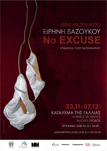 Mετά την πρόσφατη έκθεσή της στο Παρίσι με τον -προστακτικό και ευαισθητοποιημένο- τίτλο “Light the fire”, η Βαζούκου επιστρέφει στη γενέτειρά της, τη Ρόδο, μεταφέροντας μέρος των έργων που εκτέθηκαν εκεί αλλά και παρουσιάζοντας νέα δουλειά. Ο τίτλος “No excuse” («Καμία δικαιολογία») είναι δανεισμένος από την ομώνυμη καμπάνια του ΟΗΕ (UN Women) που εστιάζει στα νομικά πλαίσια που χρειάζεται να ενισχυθούν, για τη διασφάλιση της ασφάλειας των γυναικών και την εξάλειψη της έμφυλης και σεξουαλικής βίας.