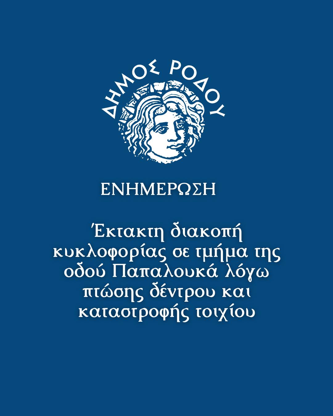 Ο Δήμος Ρόδου ενημερώνει ότι τμήμα της οδού Παπαλουκά θα παραμείνει προσωρινά κλειστό για οχήματα και πεζούς, λόγω ζημιών που προκλήθηκαν από τους θυελλώδεις ανέμους που πνέουν στην περιοχή.
