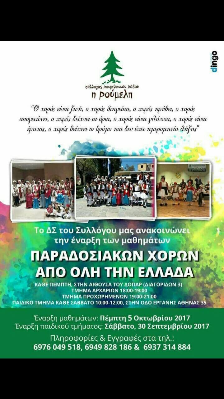 Φίλες και Φίλοι, -Ο Σύλλογος Ρουμελιωτών Ροδου "Η ΡΟΥΜΕΛΗ" , ανακοινώνει την έναρξη μαθημάτων παραδοσιακών χορών από όλη την Ελλάδα. Υποσχόμενος και φέτος να καλύψει τις προσδοκίες σας στη διδασκαλία του Ελληνικού παραδοσιακού χορού, θα λειτουργήσουν τμήματα παιδικό - εφηβικό και ενηλίκων, ως εξής: Πέμπτη : 18.00-19.00 , τμήμα αρχαρίων 19.00-21.00, τμήμα ενηλίκων . Έναρξη : Πέμπτη 05 Οκτωβρίου 2017, στην αίθουσα του ΔΟΠΑΡ, Διαδοριδων 3. Σάββατο: 10.00-12.00, παιδικό-εφηβικό. Έναρξη: Σάββατο 30 Σεπτεμβρίου 2017, Εργάνης Αθηνάς 35. Πληροφορίες - Εγγραφές στα τηλ: 697 6049518 , 694 9828186 κ 6937314884. «Ας κρατήσουν οι χοροί…» σας περιμένουμε να περάσουμε όλοι μαζίακόμη μια χρονιά,γεμάτη κέφι και χορό. Καλή χορευτική χρονιά!!!