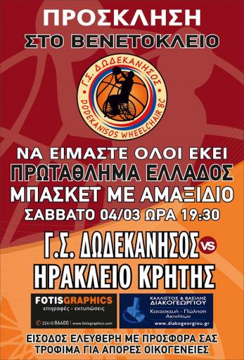 Η αντίστροφη μέτρηση για την πρεμιέρα του νέου πρωταθλήματος στο μπάσκετ με αμαξίδιο της Ο.Σ.Ε.Κ.Α. έφτασε… Ο Γ.Σ. Δωδεκάνησος υποδέχεται το Σάββατο στις 19:30, στο «Βενετόκλειο», το νεοσύστατο Ηράκλειο για τον όμιλο νότου και θέλει να κάνει ιδανικό ξεκίνημα, αφού και φέτος στόχος είναι η κατάκτηση του τίτλου στο φάιναλ-φορ που θα διεξαχθεί στο κλειστό γυμναστήριο της Κω. Η ομάδα μας συνεχίζει την προετοιμασία της για την αναμέτρηση της πρεμιέρας, με τον προπονητή Αντώνη Μαρκάκη και το γυμναστή Γιώργο Μποσγανά να έχουν όλους τους παίκτες στη διάθεσή τους. Ο Γ.Σ. Δωδεκάνησος, η διοίκηση, οι αθλητές και το προπονητικό επιτελείο περιμένουν όλο το φίλαθλο κόσμο στο πλευρό της ομάδας. Η είσοδος θα είναι ελεύθερη και με σύνθημα «ο ένας για τον άλλο, όλοι για όλους, αγάπα τον πλησίον σου», ο Γ.Σ. Δωδεκάνησος ρίχνεται στη μάχη της διάκρισης. Οι κυπελλούχοι ΕΛΛΑΔΑΣ σε περιμένουν και φέτος στο «Βενετόκλειο»… ΤΡΟΦΙΜΑ ΓΙΑ ΙΕΡΟ ΣΚΟΠΟ Το προσεχές Σάββατο στις 19:30 ο Γ.Σ. Δωδεκάνησος θα φιλοξενήσει το Ηράκλειο στην πρεμιέρα του ομίλου νότου του πρωταθλήματος της Ο.Σ.Ε.Κ.Α. και για μία ακόμη φορά θα δείξει το πλούσιο κοινωνικό του πρόσωπο. Σε συνεργασία με την Ομοσπονδία στο μπάσκετ με αμαξίδιο, την Τ.Ε. Ε.Ο.Κ. Δωδεκανήσου και την Ε.Π.Σ.Δ. ο Γ.Σ. Δωδεκάνησος θα συγκεντρώσει τρόφιμα μακράς διαρκείας τα οποία θα παραδώσει στο κοινωνικό παντοπωλείο της Ρόδου. Το Σάββατο 4 Μαρτίου από τις 18:30 στο «Βενετόκλειο» θα γίνεται η συγκέντρωση των τροφίμων που θα παραδοθούν στο κοινωνικό παντοπωλείο και στη συνέχεια θα διατεθούν σε άπορους συμπολίτες μας.