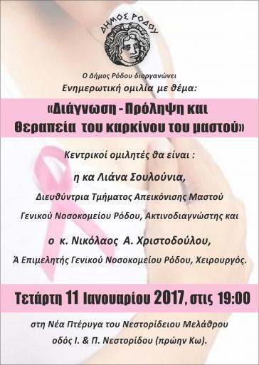 Ημερομηνία-Η προγραμματισμένη για αύριο, Τετάρτη 11 Ιανουαρίου 2017, ενημερωτική ομιλία με θέμα: Διάγνωση-Πρόληψη και Θεραπεία του καρκίνου του μαστού, θα πραγματοποιηθεί στην παλαιά πτέρυγα του Νεστορίδειου Μέλαθρου, Πλατεία Γ. Χαρίτου , 100 Χουρμαδιές.