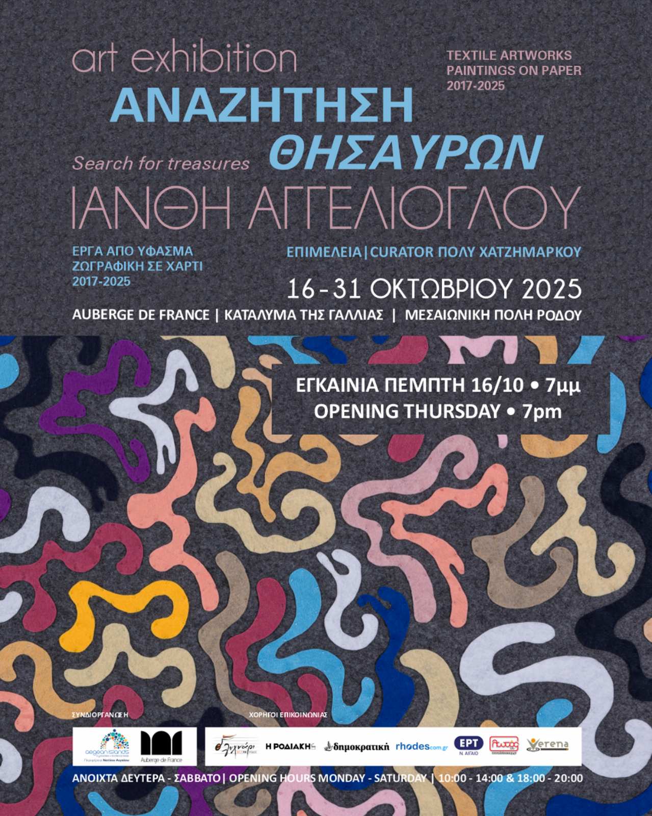 Εγκαινιάζεταιητρίτηατομική έκθεση της Ιάνθης Αγγελίογλου, με τίτλο“Αναζήτηση Θησαυρών”,στο Κατάλυμα της Γαλλίας στη Μεσαιωνική Πόλη της Ρόδου.