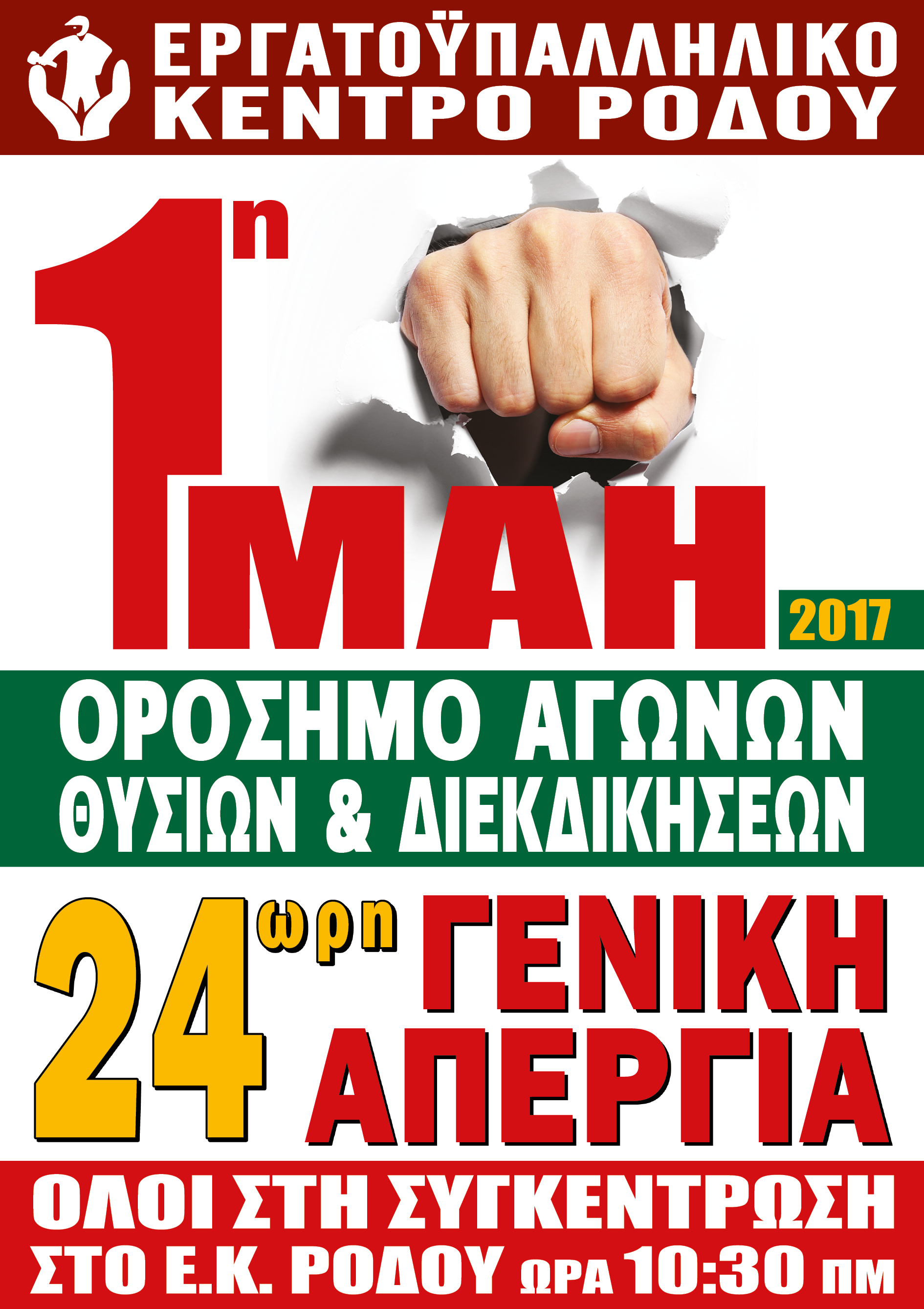 ΔΕΛΤΙΟ ΤΥΠΟΥ -1Η ΜΑΗ -ΗΜΕΡΑ ΜΝΗΜΗΣ ΤΙΜΗΣ ΚΑΙ ΑΓΩΝΑ -Το Εργατοϋπαλληλικό Κέντρο Ρόδου συμμετέχει στην 24ωρη Γενική Απεργία για τον εορτασμό της Εργατικής Πρωτομαγιάς καιτιμά την ημέρα αυτή με συγκέντρωση και μουσική εκδήλωση, τη Δευτέρα, 1η Μάη 2017, έξω από το Ε.Κ.Ρ, ώρα 10.30 πμ. Έχοντας συνείδηση της ευθύνης και του χρέους που έχουμε απέναντι στους εργάτες που έχασαν τη ζωή τους αγωνιζόμενοι για κοινωνική δικαιοσύνη, ανθρώπινα και εργασιακά δικαιώματα, αγωνιζόμαστε ενωμένοι ενάντια στις βάρβαρες και αδιέξοδες πολιτικές των κυβερνήσεων, που τα τελευταία επτά χρόνια έχουν οδηγήσει τη χώρα μας σε οικονομική και κοινωνική εξουθένωση. Αντιπαλεύουμετις αντεργατικές και αντικοινωνικές νεοφιλελεύθερες συνταγές, που εξοντώνουν τους εργαζομένους, εξαθλιώνουν την κοινωνία, διευρύνουν την ύφεση και την κρίση. Τιμώντας τους πρωτοπόρους αγωνιστές του εργατικού κινήματος, όλους εκείνους που θυσιάστηκαν διαχρονικά για τα μεγάλα και ιερά δικαιώματα της τάξης μας, όλους εκείνους που υπερασπίστηκαν με την ίδια τη ζωή τους τη ΔΗΜΟΚΡΑΤΙΑ, τη ΔΙΚΑΙΟΣΥΝΗ, την ΙΣΟΤΗΤΑ, την ΕΛΕΥΘΕΡΙΑκαι την ΕΙΡΗΝΗ, οφείλουμε ΟΛΟΙ ΜΑΖΙ να δώσουμε αγωνιστικό παρόν στην 24ωρηΑπεργίακαι στη συγκέντρωσηστο Ε.Κ.Ρ, τη Δευτέρα, 1η Μάη. Καλούμε όλους τους εργαζόμενους,τους συνταξιούχους, του ανέργους, τους νέους και τις νέες να τιμήσουν τη μεγάλη αυτή ημέρα,που αποτελεί ορόσημο Αγώνων, Θυσιών και Διεκδικήσεων. Στην εκδήλωση για τον εορτασμό της Εργατικής Πρωτομαγιάς θα συμμετέχουν οι παρακάτω καλλιτέχνες :