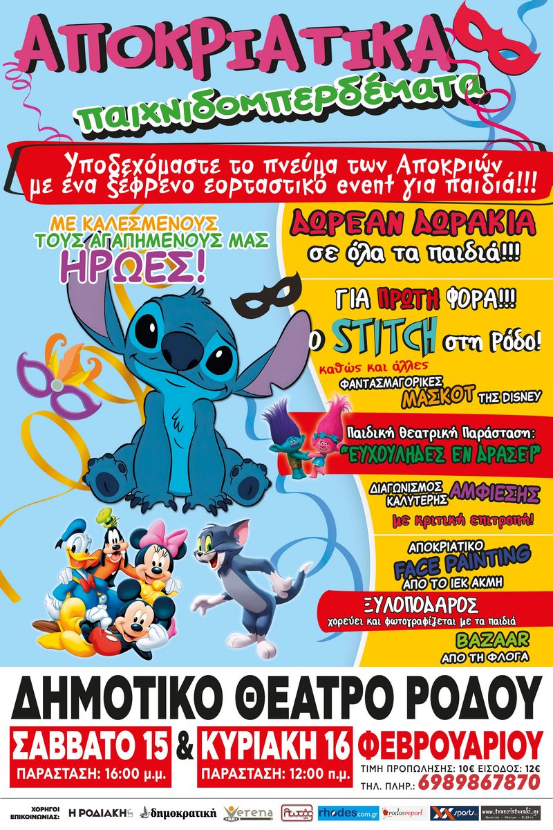 Υποδεχόμαστε το πνεύμα των αποκριών με ένα να ξεκαρδιστικό και πρωτοτυπο show για παιδιά αλλά και γονείς,με πολλές εκπλήξεις, παιχνίδι, τραγούδι και χορό!!!