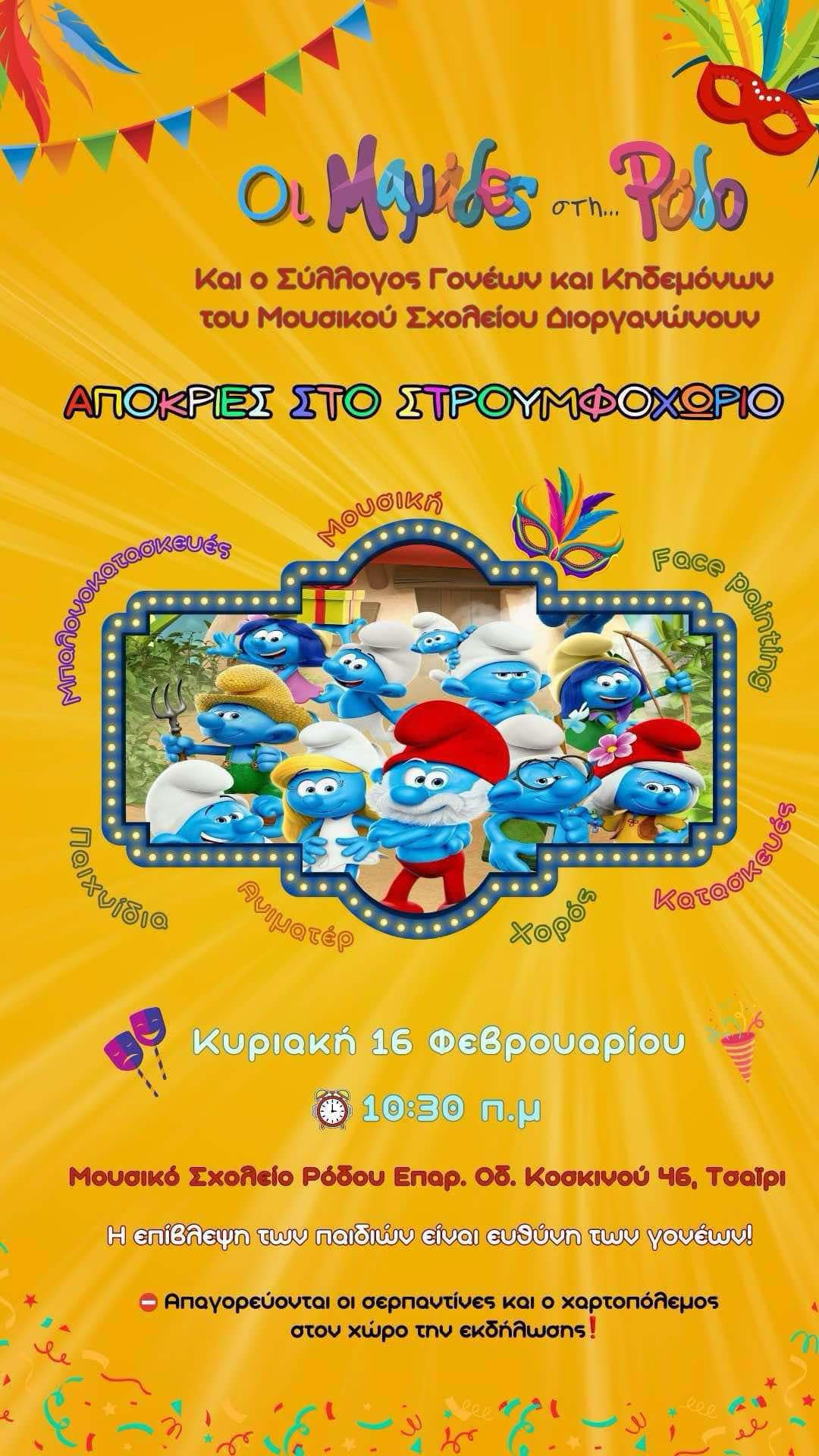 Φέτος οι Απόκριες θα γίνουν…μπλε, καθώς οι «Μαμάδες στη Ρόδο» σε συνεργασία με τον Σύλλογο Γονέων και Κηδεμόνων του Μουσικού σχολείου Ρόδου αναβιώνουν τη Στρουμφοϊστορία σε μία αποκριάτικη εκδήλωση με θέμα το «Το Στρουμφοχωριό» την Κυριακή 16 Φεβρουαρίου στο Μουσικό σχολείο Ρόδου και ώρα 10.30 π.μ.