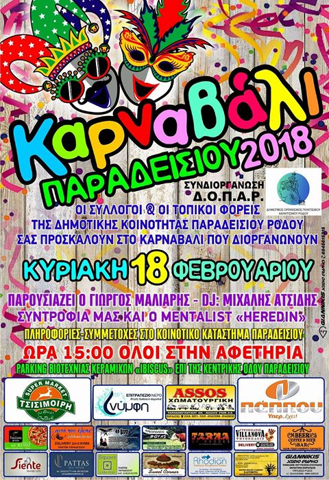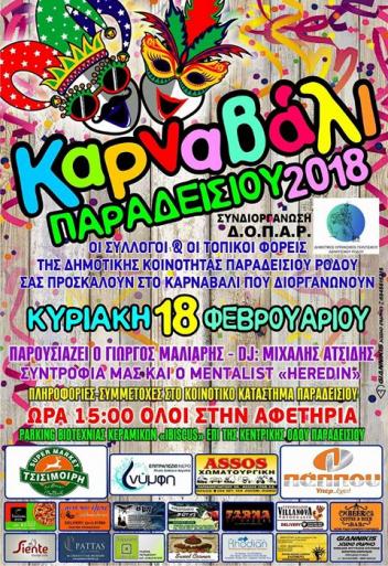Ο Δήμος Ρόδου – Δ.Ο.Π.Α.Ρ. σε συνεργασία με την Δημοτική Κοινότητα Παραδεισίου και τους Συλλόγους- Φορείς του χωριού θα πραγματοποιήσουν αποκριάτικο καρναβάλι , την Κυριακή 18 Φεβρουαρίου 2018 και ώρα 15:00. Το πρόγραμμα περιλαμβάνει παρέλαση αρμάτων και πεζοπόρων τμημάτων στον κεντρικό δρόμο «Λεωφόρος Δημοκρατίας» με κατάληξη την κεντρική πλατεία, όπου θα στηθεί ένα μεγάλο πάρτι με μουσική, χορό , ταχυδακτυλουργικά και άφθονο κρασί για όλους.