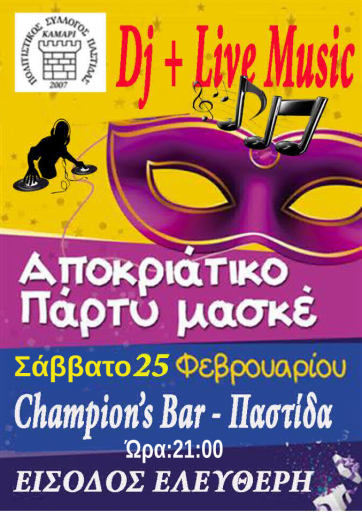 ΔΕΛΤΙΟ ΤΥΠΟΥ-«Αποκριάτικο πάρτυ-μασκέ με Dj και Ζωντανή Μουσική στην Παστίδα από το “Καμάρι”» -Ο Πολιτιστικός Σύλλογος Παστίδας Ρόδου “Καμάρι” διοργανώνει μασκέ – πάρτυ για όσους θέλουν να διασκεδάσουν και να ξεφαντώσουν σε αποκριάτικους ρυθμούς ! Αφήστε για λίγο στην άκρη τα προβλήματα που μας περιβάλλουν και ελάτε να δώσουμε χρώμα, χορεύοντας latin και όχι μόνο, σε μια αξέχαστη βραδιά με Dj και Ζωντανή Μουσική. Φορέστε την πιο φανταχτερή αποκριάτικη στολή σας κι ελάτε να διασκεδάσουμε. Το αποκριάτικο πάρτυ θα γίνει στο CHAMPION'S BAR στην Παστίδα τοΣάββατο 25 Φεβρουαρίου 2017. Η είσοδος είναι ελεύθερη. Ώρα Έναρξης : 21:00