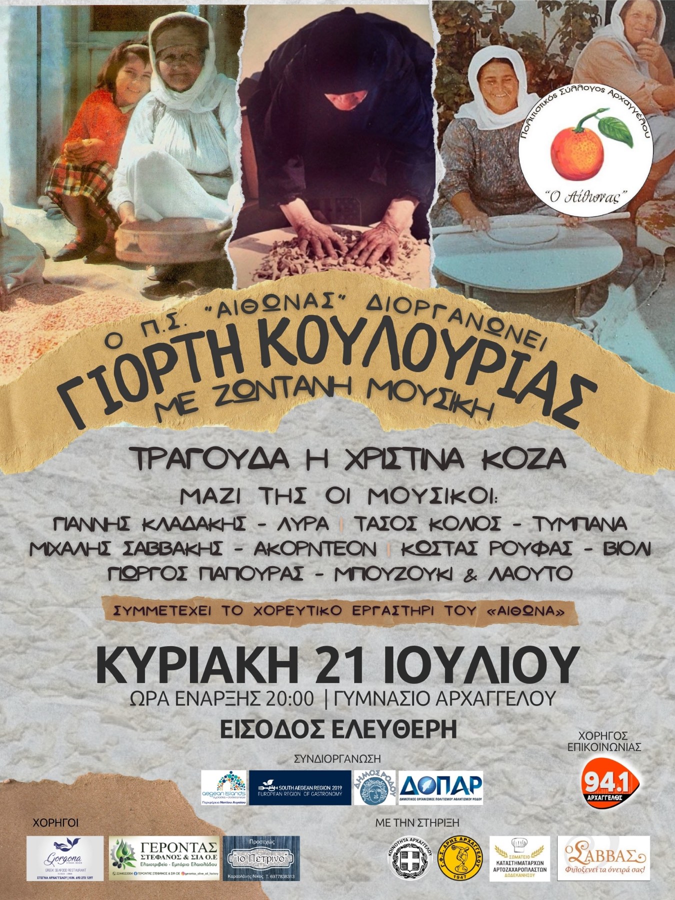 Ο Πολιτιστικός Σύλλογος Αρχαγγέλου "Αίθωνας" σας προσκαλεί στη Γιορτή Κουλουρίας την Κυριακή 21Ιουλίουστις 20.00 στον αύλειο χώρο του Γυμνασίου Αρχαγγέλου.