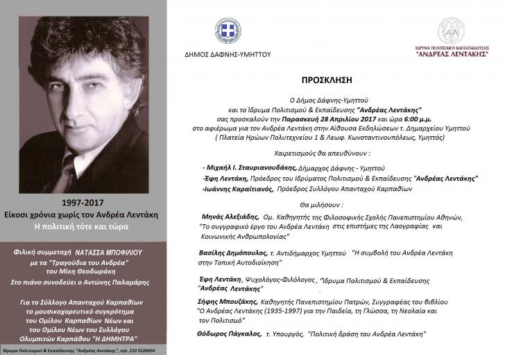 Αφιέρωμα στον Ανδρέα Λεντάκη θα πραγματοποιήσει ο Σύλλογος Απανταχού Καρπαθίων στην αίθουσα εκδηλώσεων τ. Δημαρχείου Υμηττού. Η εκδήλωση θα λάβει χώρα την Παρασκευή 28 Απριλίου 2017 και ώρα 6.00μ.μ.