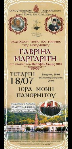 Στα πλαίσια του φεστιβάλ Σύμης, αύριο στις 19:00 θα πραγματοποιηθεί εκδήλωση-αφιέρωμα στον Μακαριστό ηγούμενο της Ιεράς μονής Πανορμίτου , Γαβριήλ. Το πρόγραμμα έχει την ακόλουθη πορεία: Στις 19:00 Εσπερινός στην Ιερά Μονή Πανορμίτου , στις 20:00 Φιλολογική βραδιά και στη συνέχεια βυζαντινοί ύμνοι από την βυζαντινή χορωδία "Βυζαντινοί Υμνωδοί". Η εκδήλωση περιλαμβάνεται στο επίσημο πρόγραμμα του φεστιβάλ Σύμης 2018 και τέλει υπό την αιγίδα του Δήμου Σύμης και την Ιεράς Μητρόπολης Σύμης. Με τιμή, Ο Δήμαρχος Ελ. Παπακαλοδούκας