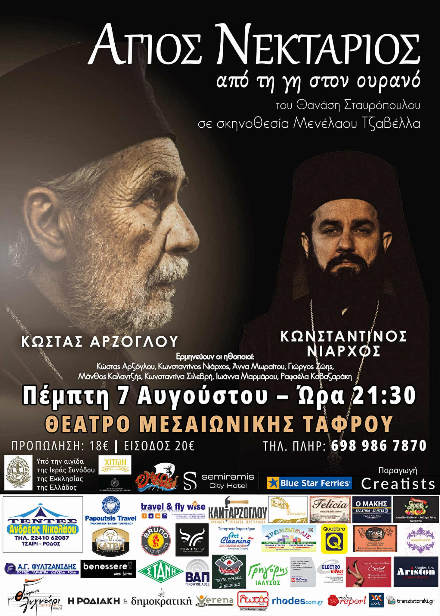 Την Πέμπτη 07 Αυγούστου στο Θεατρο της Μεσαιωνικής Τάφρου ανεβαίνει για πρώτη φορά στη Ρόδο η θεατρική παράσταση "Άγιος Νεκτάριος, από τη γη στον ουρανό"