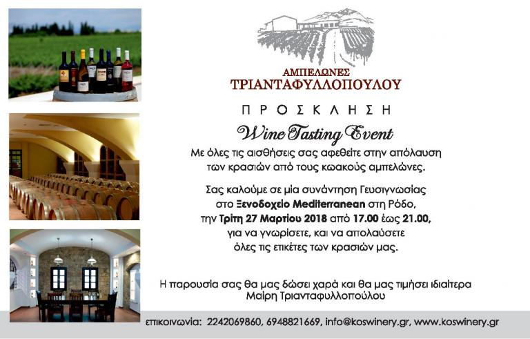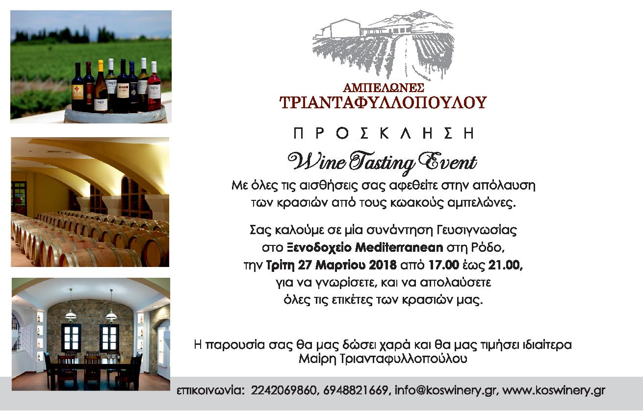 Δ Ε Λ Τ Ι Ο Τ Υ Π Ο Υ-Θέμα: Αύριο Τρίτη, 27 Μαρτίου, η εκδήλωση γευσιγνωσίας από τους αμπελώνες Τριανταφυλλοπούλου στο ξενοδοχείο Mediterranean, 17.00-21.00 -Οι αμπελώνες Τριανταφυλλοπούλου, συναντούν το κοινό και τους επαγγελματίες της εστίασης , για να γνωρίσουν ξεχωριστές ποικιλίες κρασιών πρεσβευτές του Δωδεκανησιακού αμπελώνα στους επισκέπτες και η καλύτερη παρέα στο τραπέζι μας. Η εκδήλωση πραγματοποιείται την Τρίτη 27 Μαρτίου, είναι ανοικτή στο κοινό, από 17.00-21.00, στο ξενοδοχείο Mediterranean. Τα κρασιά του κτήματος Τριανταφυλλοπούλου έχουν τον χαρακτηρισμό ΠΓΕ (Προϊόντα με Γεωγραφική Ένδειξη ΚΩ), είναι εξαιρετικής ποιότητας και έχουν βραβευθεί σε διεθνείς διαγωνισμούς. Πρόσφατα διακρίθηκαν τα κρασιά Μαλαγουζιά Sauvignon blanc 2017 και το Δίκαιο Οίνος, Αθήρι Ασύρτικο 2017 με χρυσά μετάλλια στον διεθνή Διαγωνισμό Berliner Wein Trophy 2017. Το οινοποιείο βρίσκεται στην Κω, στους πρόποδες του όρους Δίκαιος, είναι μοντέρνας αισθητικής και με όλες τις προδιαγραφές για την παραγωγή υψηλής ποιότητας κρασιού. Το επισκέπτονται χιλιάδες επισκέπτες ετησίως, οι οποίοι γίνονται οι καλύτεροι πρεσβευτές όχι μόνο του επώνυμου ελληνικού κρασιού, αλλά και άλλων τοπικών προϊόντων της Δωδεκανήσου που δοκιμάζουν εκεί. Ο ιδιόκτητος πρότυπος αμπελώνας καταλαμβάνει 120 στρέμματα. Ο συνδυασμός του κατάλληλου εδάφους με τις εφαρμοζόμενες καλλιεργητικές τεχνικές συντελεί στην άριστη ανάπτυξη του αμπελώνα σε όλα του τα στάδια και εξασφαλίζει μια ομαλή πορεία ωρίμανσης των σταφυλιών. Φυτεύτηκαν και καλλιεργούνται με ιδιαίτερη φροντίδα ελληνικές ποικιλίες, όπως ή αρωματική Μαλαγουζιά και τα Αιγιοπελαγίτικα Αθήρι και Ασύρτικο, καθώς και διεθνείς, η βαθυκόκκινη Merlot, η πολυδυναμική Chardonnay , η αριστοκρατική Syrahκαι το κoσμοπολίτικο Cabernet Sauvignon. Παράλληλα διατηρείται και ένας πειραματικός αμπελώνας με πλήθος διαφορετικών ελληνικών ποικιλιών με σκοπό την μελέτη της προσαρμογής τους, διότι η φροντίδα και η επέκταση του αμπελώνα δε σταματάει ποτέ.
