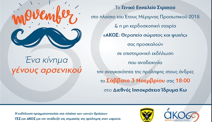 Το Γενικό Επιτελείο Στρατού και η ΑΚΟΣ γιορτάζουν τον Movember με μία επιστημονική εκδήλωση με την οποία καλούν τους άνδρες να θέσουν ως προτεραιότητα την προάσπιση της υγείας τους, εγκαταλείποντας τις βλαβερές συνήθειες και υιοθετώντας έναν υγιεινό και ισορροπημένο τρόπο ζωής.