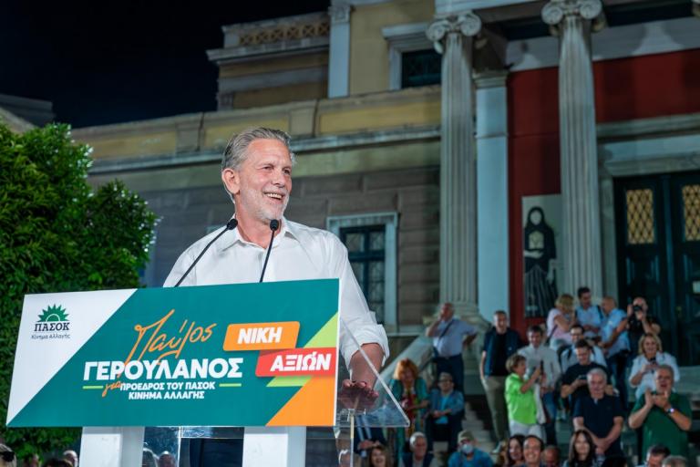 «Η μόνη υποψηφιότητα που διασφαλίζει αλλαγή ηγεσίας στον δεύτερο γύρο, είναι η δική μας υποψηφιότητα» τόνισε σε μεγαλειώδη συγκέντρωση νίκης, στο κέντρο της Αθήνας, ο υποψήφιος Πρόεδρος του ΠΑΣΟΚ-Κινήματος Αλλαγής, Παύλος Γερουλάνος και συμπλήρωσε: «Απευθύνομαι σε κάθε μέλος και φίλο του ΠΑΣΟΚ που θα έρθει στην κάλπη, που πιστεύει ότι χρειάζεται αλλαγή σελίδας στο Πανελλήνιο Σοσιαλιστικό Κίνημα, για να νικήσουμε τη Νέα Δημοκρατία στις επόμενες εκλογές: Στις 6 Οκτωβρίου, ζητώ την ψήφο σας! Με την εμπιστοσύνη σας, να πάμε στον δεύτερο γύρο! Και εγώ, στις 13 Οκτωβρίου, εγγυώμαι αλλαγή ηγεσίας στο ΠΑΣΟΚ! Εγγυώμαι, την απαρχή μιας νέας πορείας νίκης, για το Πανελλήνιο Σοσιαλιστικό Κίνημα!»