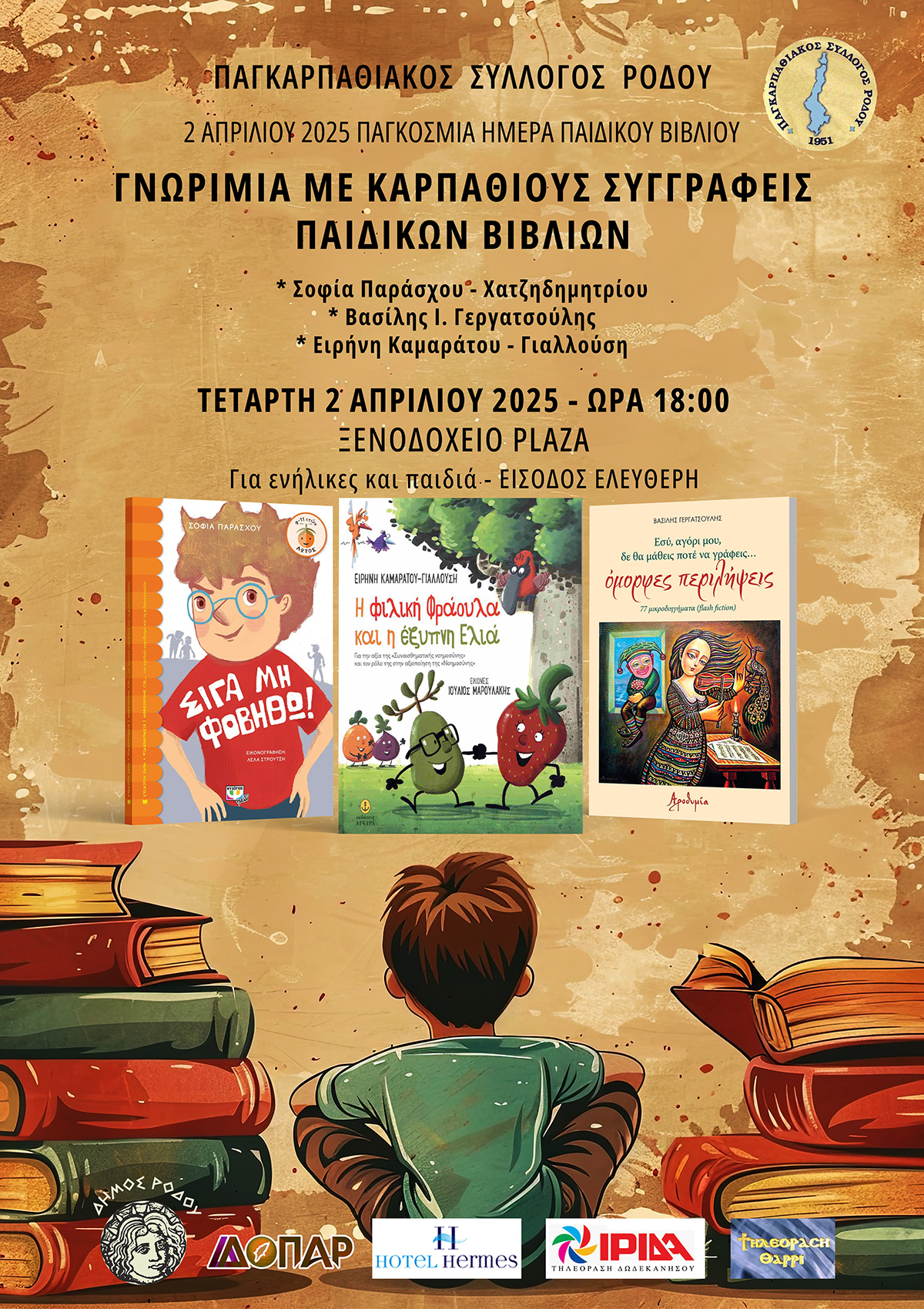 Ο ΠΑΓΚΑΡΠΑΘΙΑΚΟΣ ΣΥΛΛΟΓΟΣ ΡΟΔΟΥ σε συνδιοργάνωση με τη Δ/νση ΔΟΠΑΡ του Δήμου Ρόδου πραγματοποιούν, με την ευκαιρία της ΠΑΓΚΟΣΜΙΑΣ ΗΜΕΡΑΣ ΠΑΙΔΙΚΟΥ ΒΙΒΛΙΟΥ (2 Απριλίου), εκδηλώσεις για τη γνωριμία με τους Καρπάθιους συγγραφείς παιδικών βιβλίων